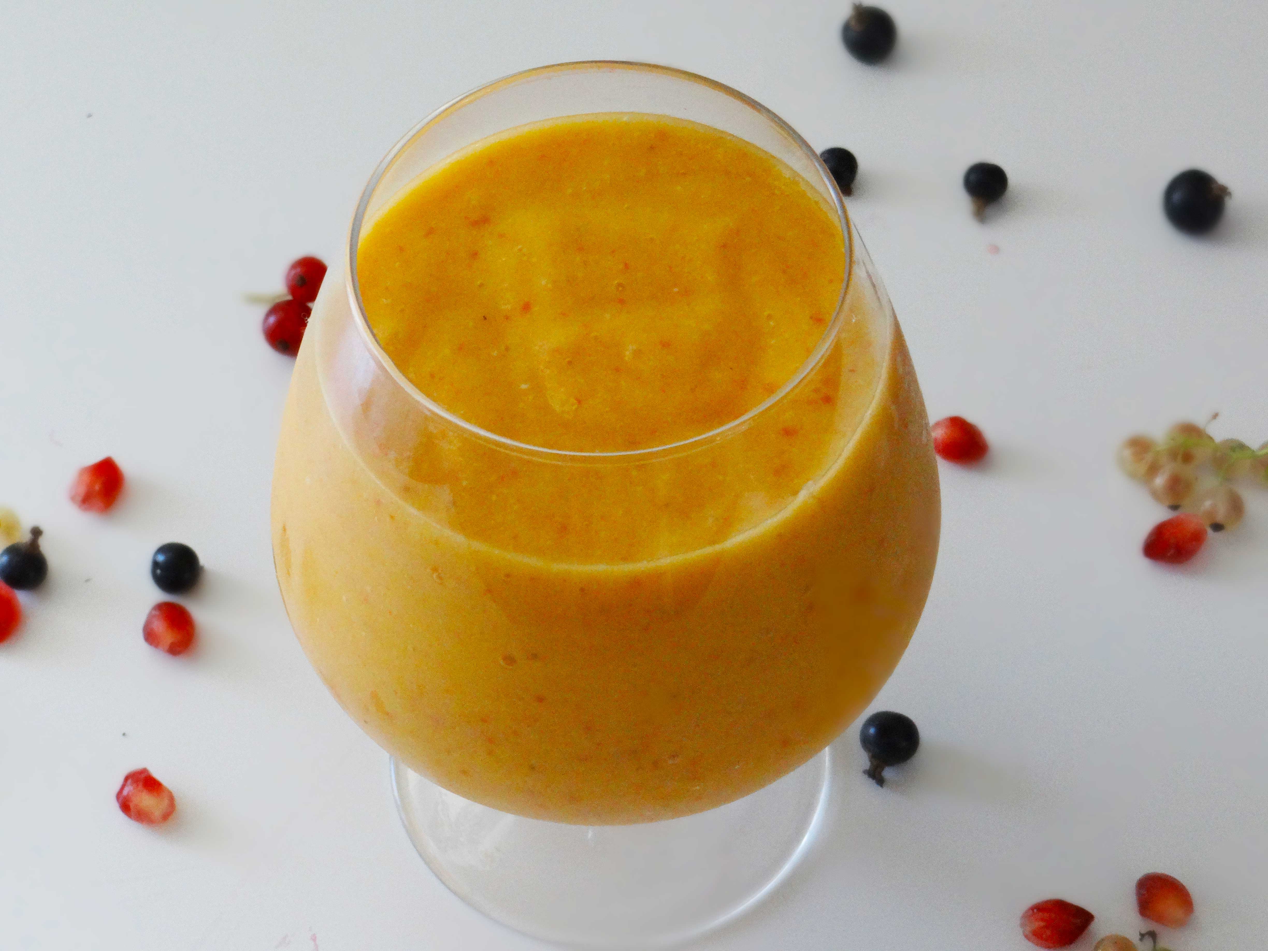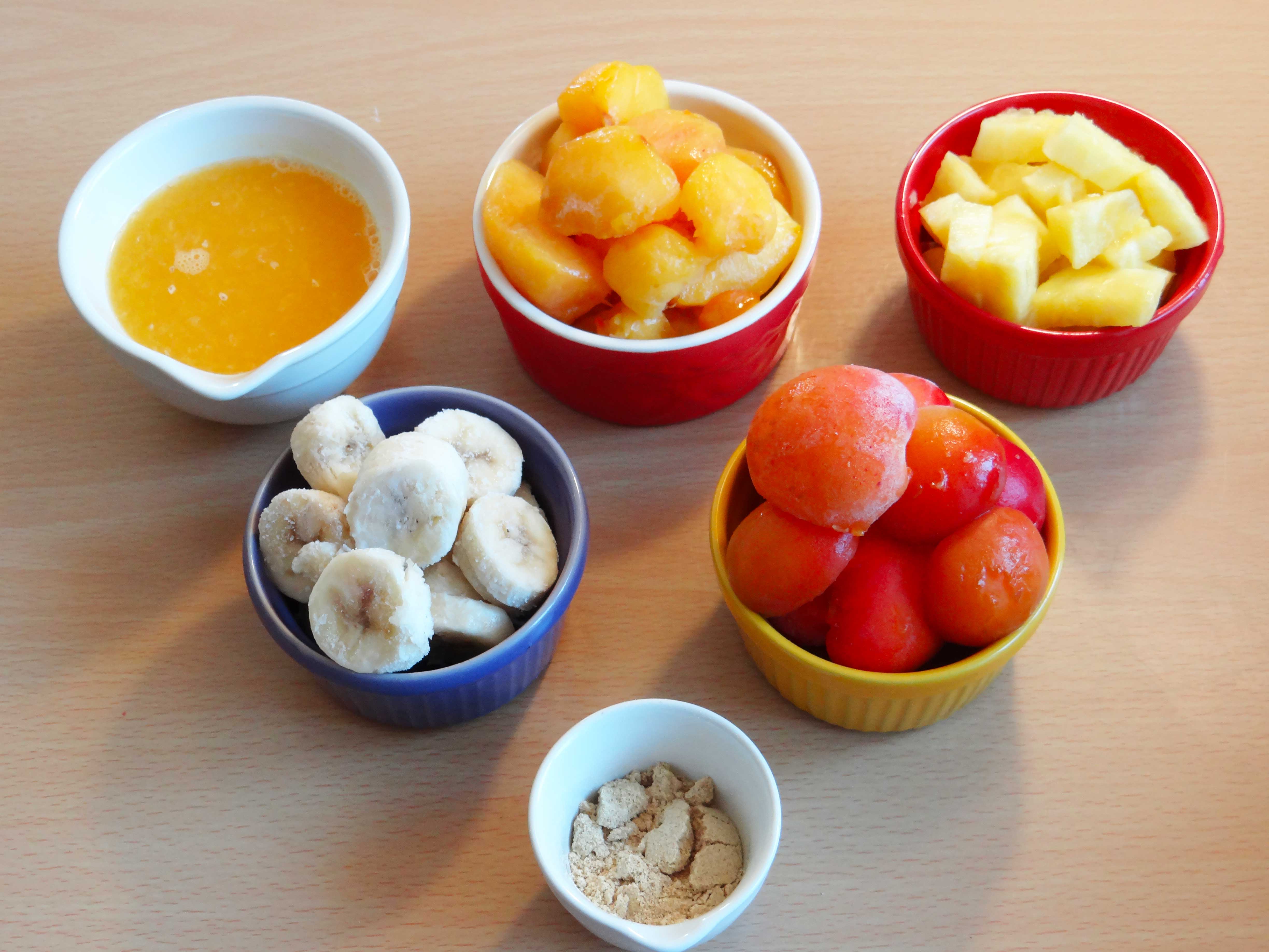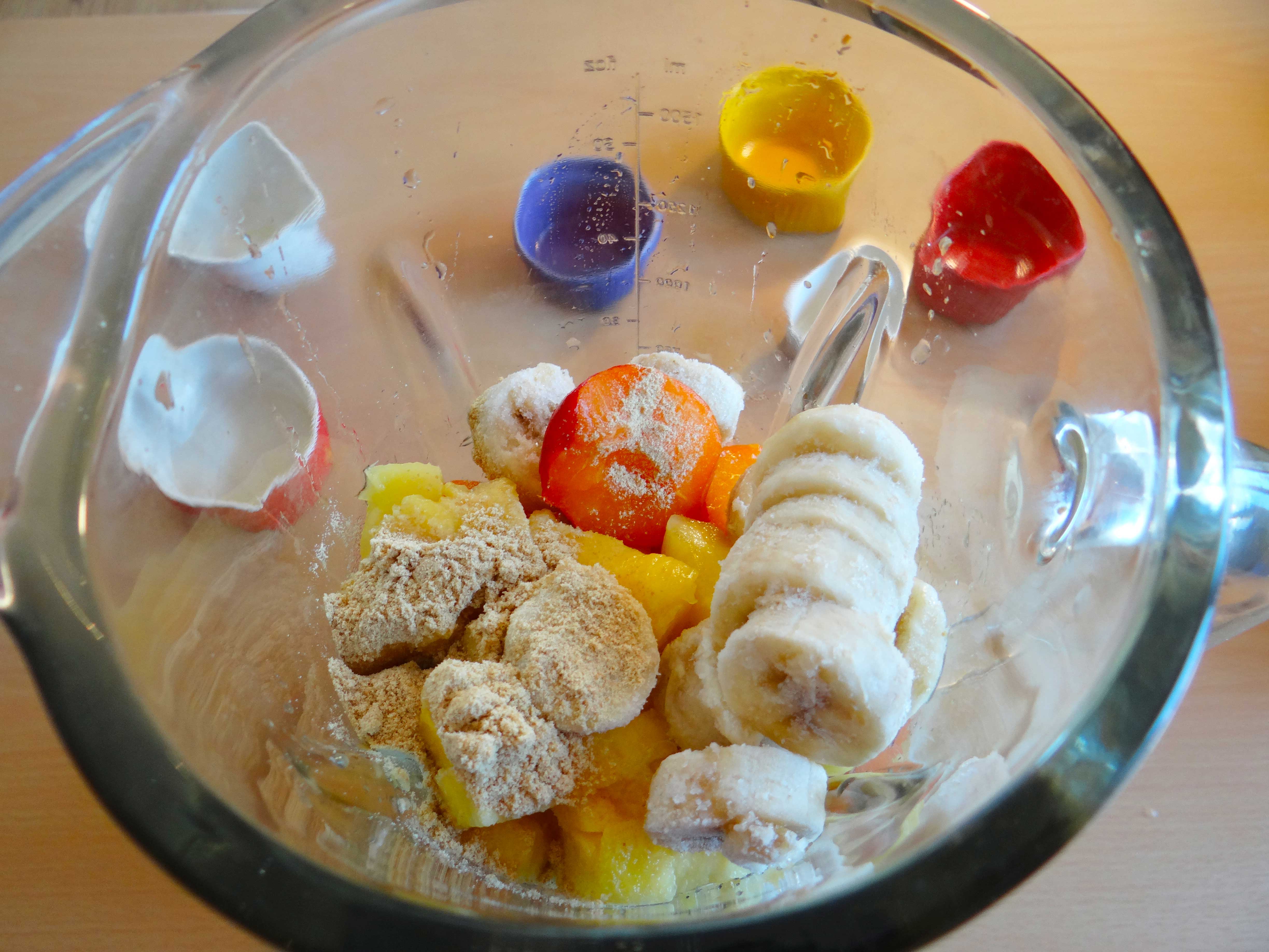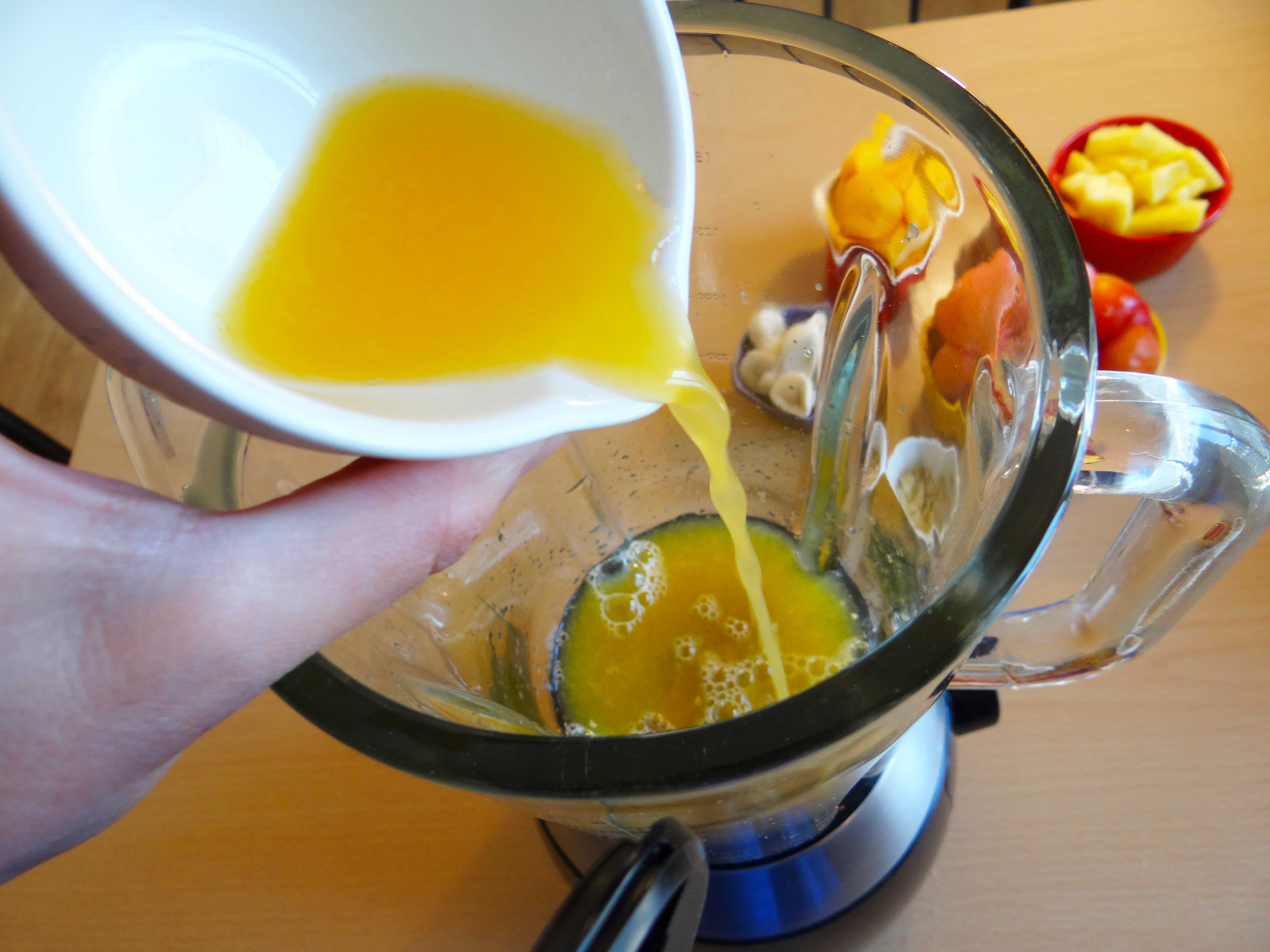 1. Turnam sucul de portocale in blender dupa care adaugam fructele si mixam bine. Deoarece am folosit mai multe fructe congelate smoothie-ul meu a avut o consistenta mai cremoasa.