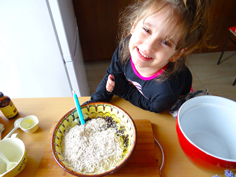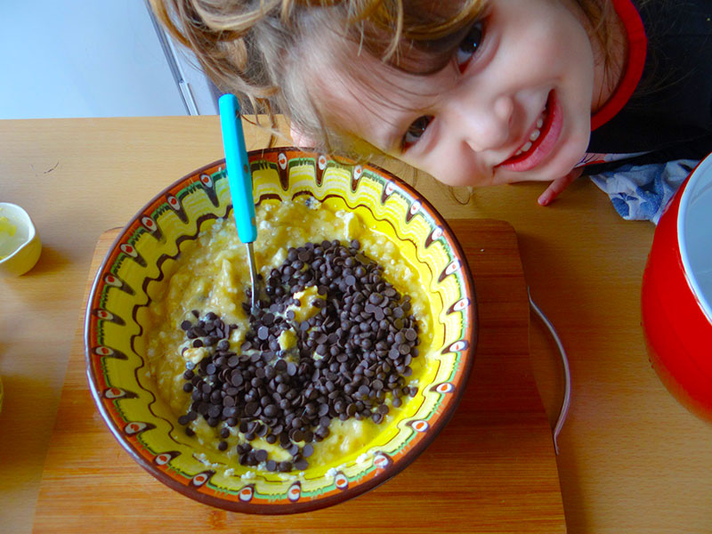4. Adăugăm făina, praful de copt și fulgii de ciocolată și iar amestecăm bine.