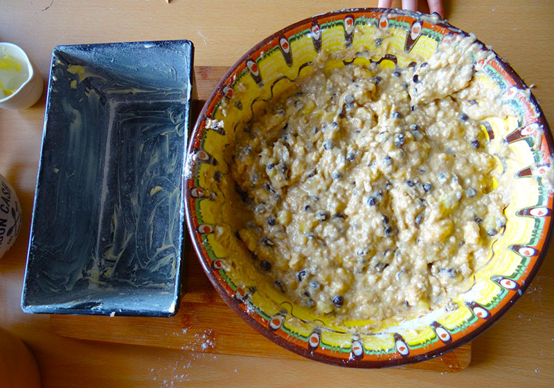1. Preîncălzim cuptorul la 180°C, ungem o tavă cu unt și o tapetăm cu făină. Tava mea are dimensiunile de 21×12 cm.