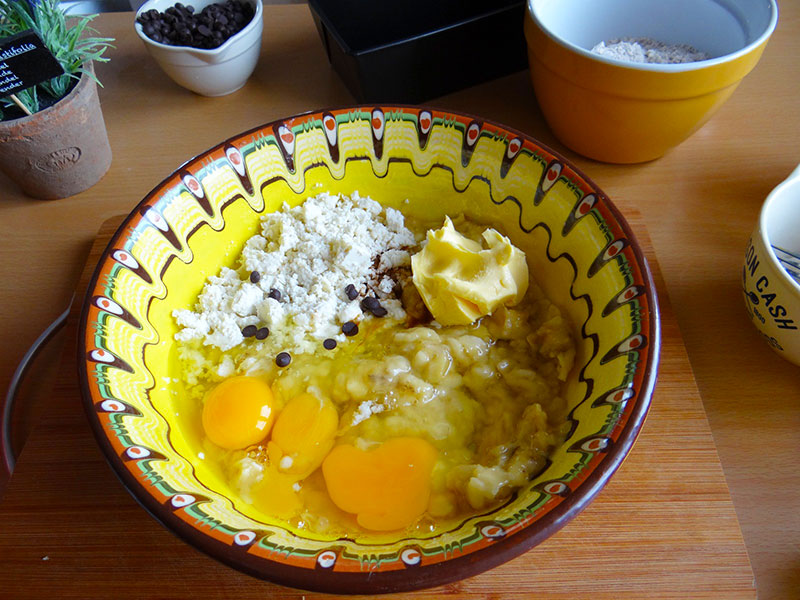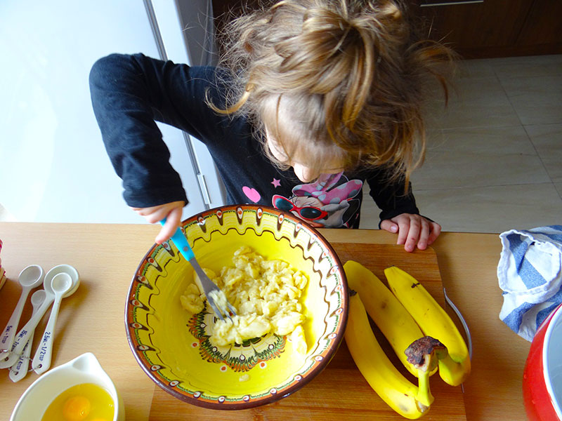 2. Punem bananele într-un bol si le pasăm cu furculița până obținem un piure.