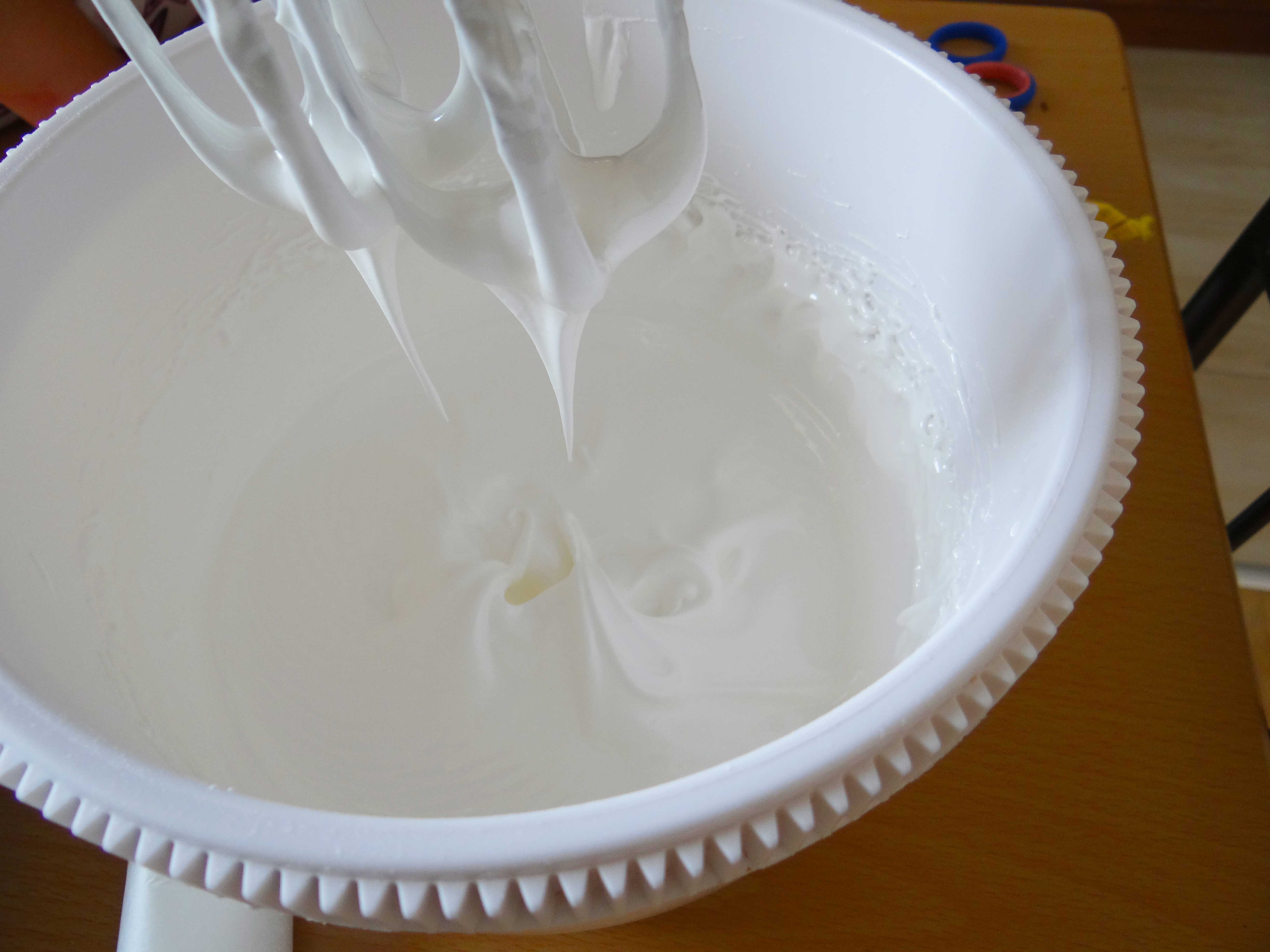 3. Batem albușurile cu un mixer, când acestea se întăresc începem să punem câte o lingură din zaharul pudră. După ce am pus tot zaharul, mixăm circa cinci minute, până când spuma devine lucioasă. Adăugăm amidonul şi sucul de lămâie, apoi mai mixăm un minut.