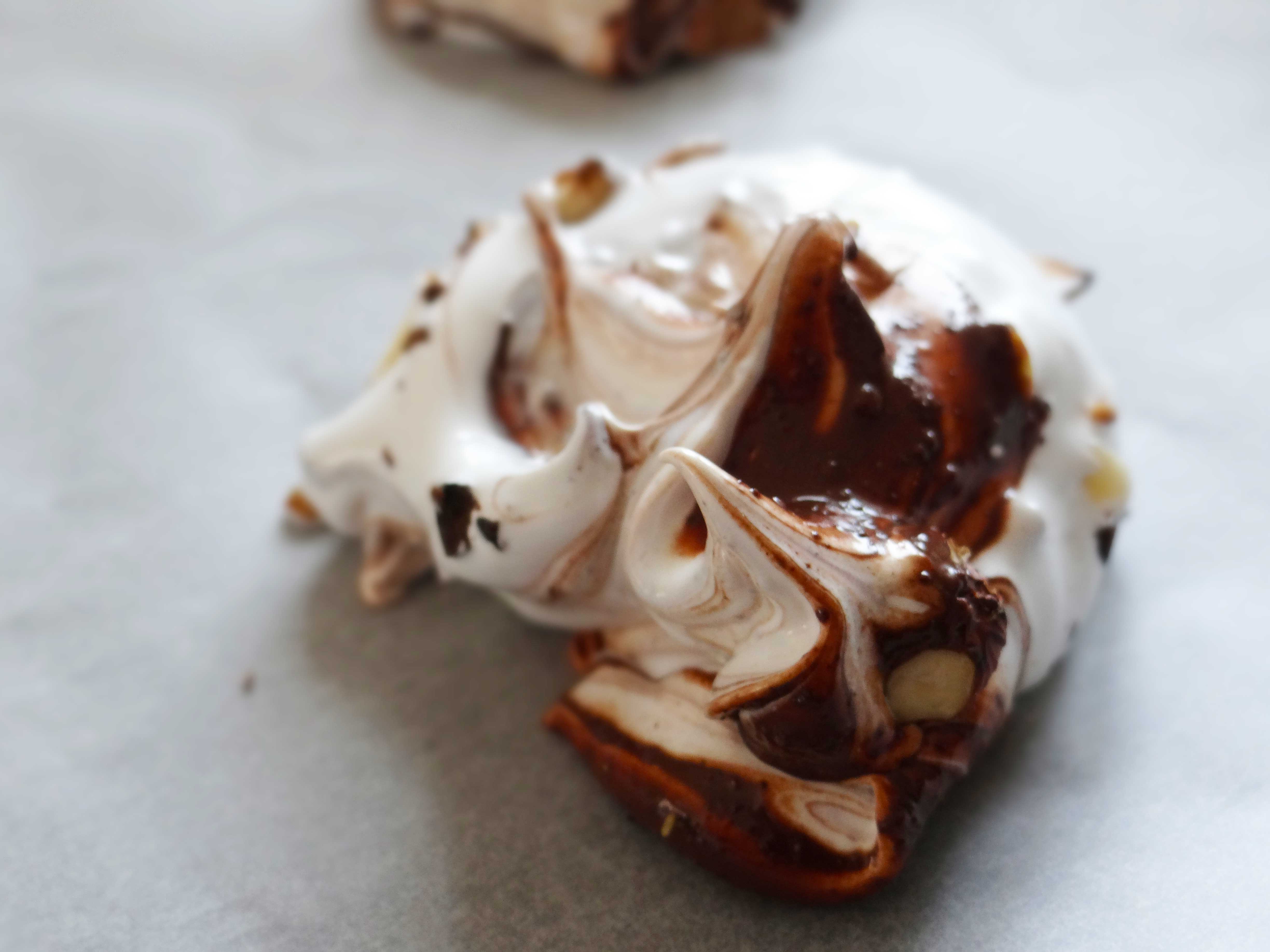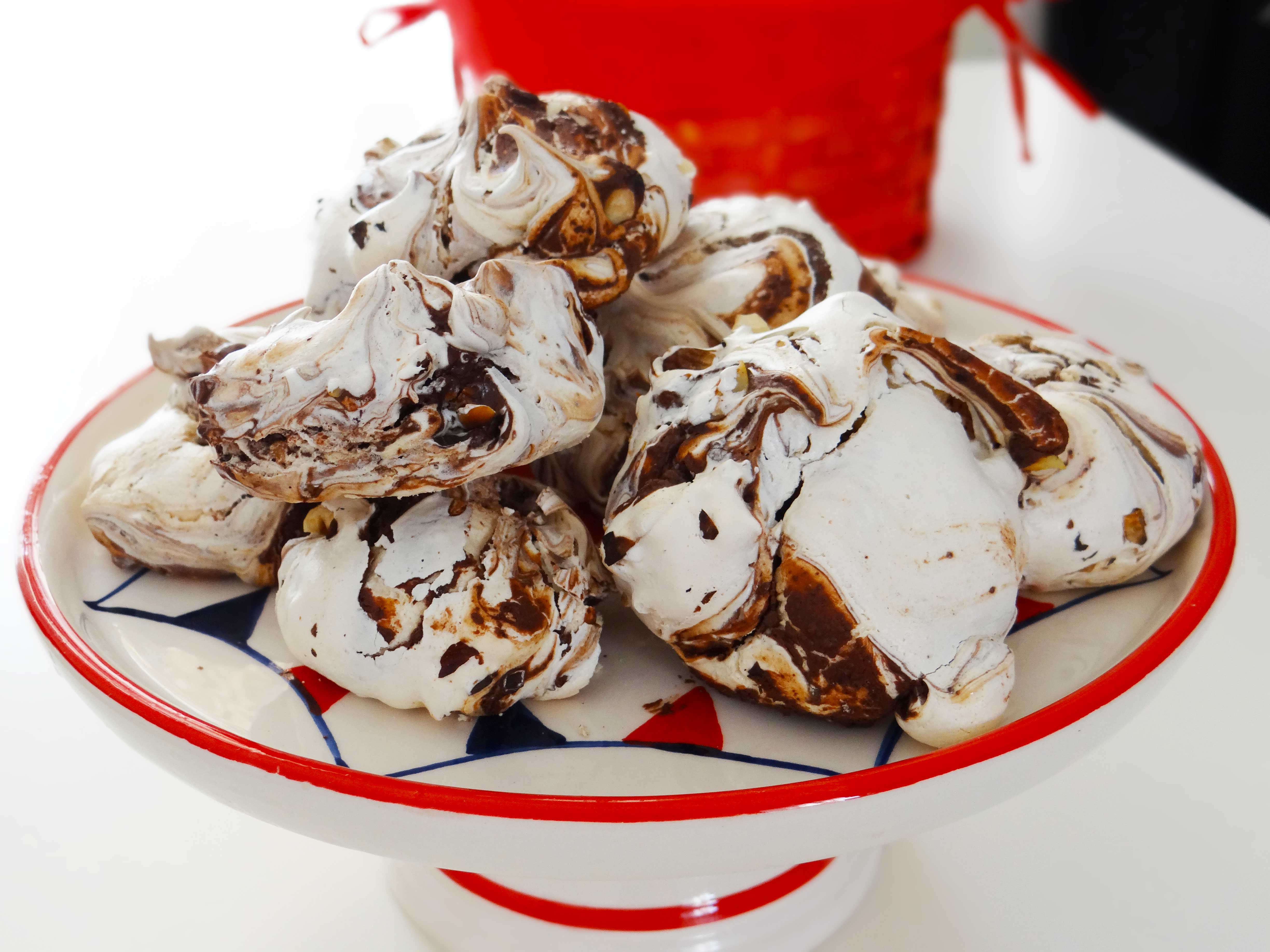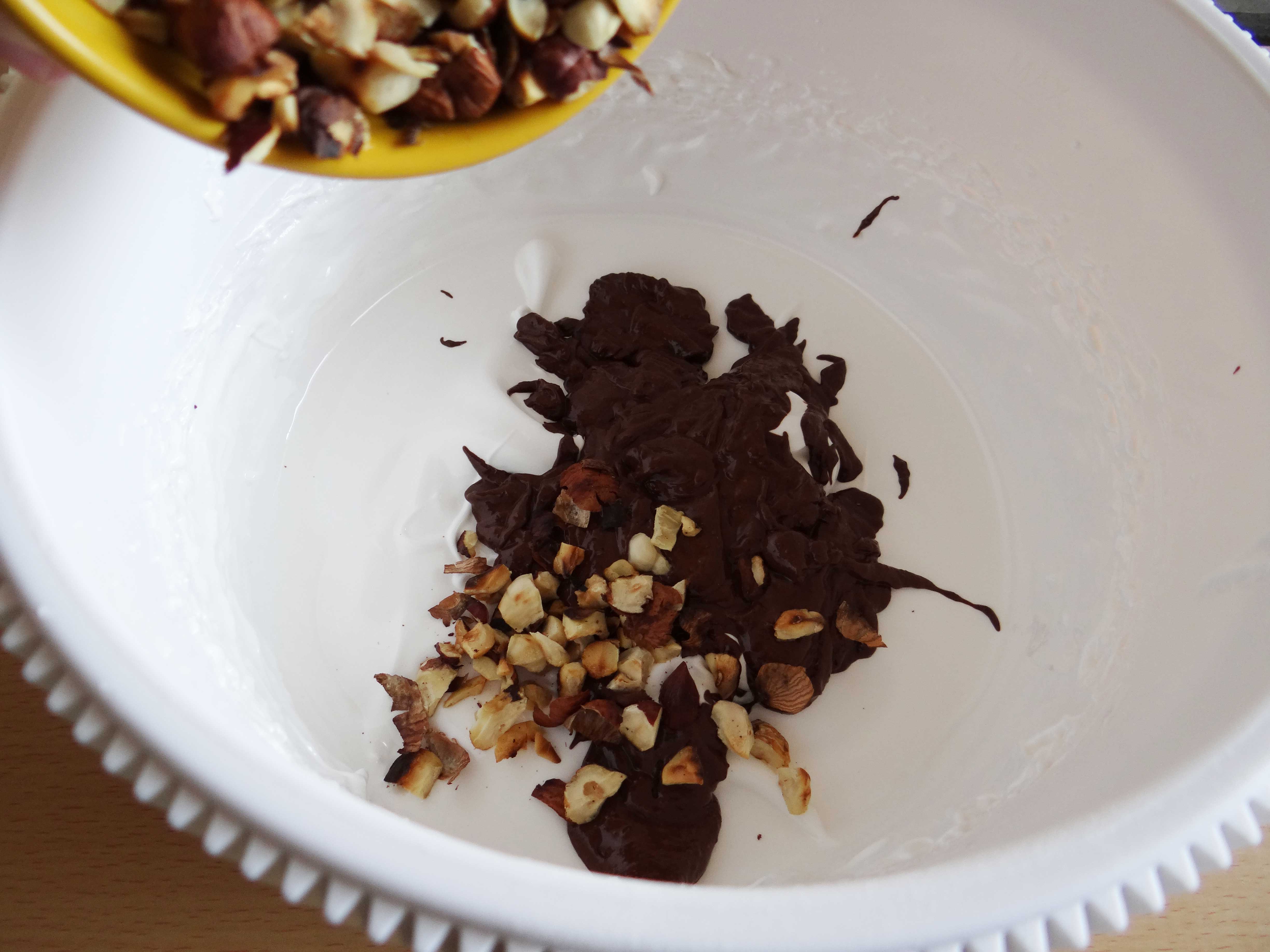 4. Adăugăm ciocolata topită și alunele. Nu amestecăm și apoi luam cu lingura compoziția și o punem într-o tavă tapetată cu hârtie de copt. Punem tava în cuptorul preîncălzit pentru 30 de minute după care oprim cuptorul, deschidem ușa şi le lăsăm să se răcească. Bezelele se păstrează într-un recipient închis ermetic.