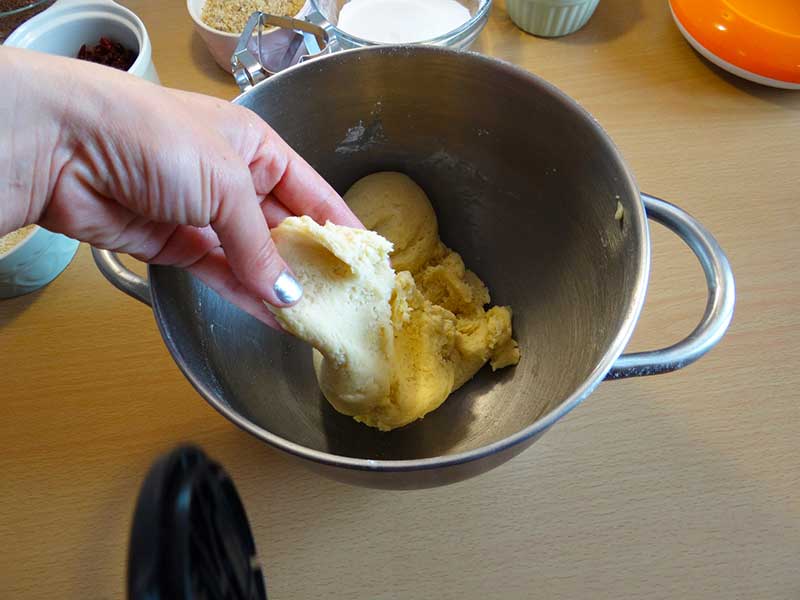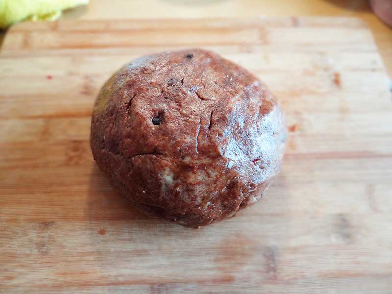 7. Încorporăm foarte bine ingredientele cu mâna și formăm un aluat căruia îi dăm o formă rotundă.