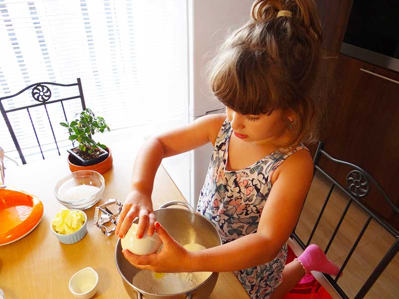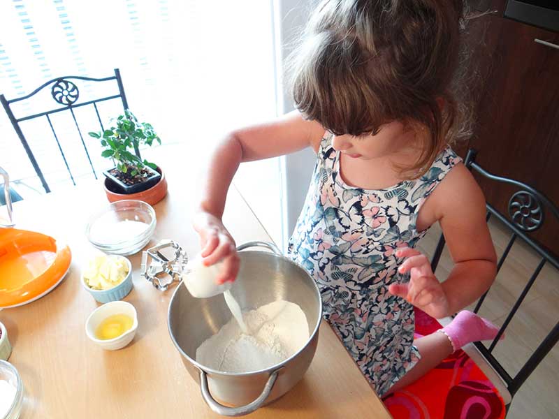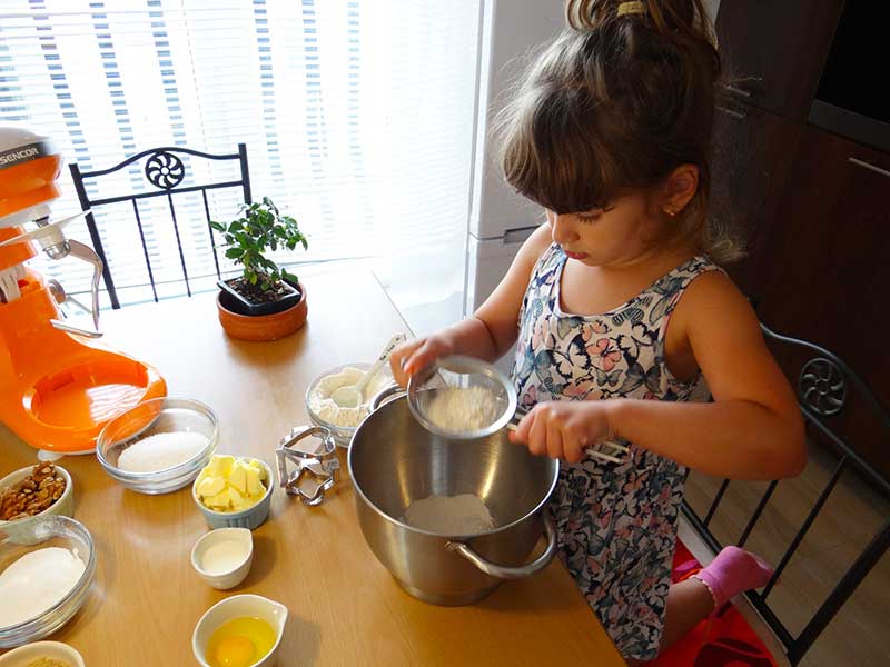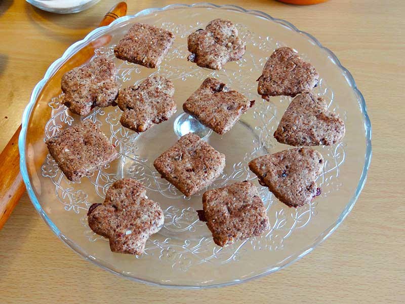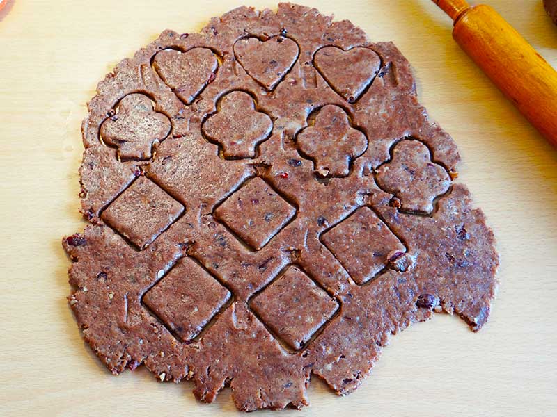 11. Cu ajutorul unei forme tăiem aluatul formând astfel biscuiții pe care îi așezăm într-o tavă tapetată cu hârtie de copt.