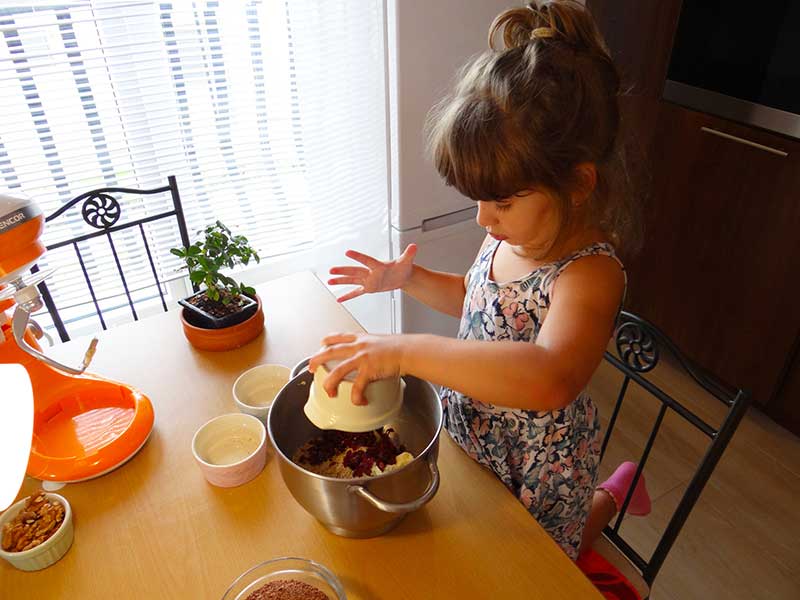 6. Acum urmează să adăugăm nuca măcinată, migdalele măcinate, ciocolata răzuită și merișoarele tăiate în bucăți mici.