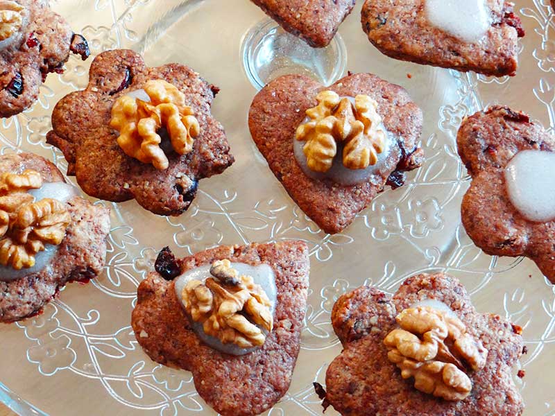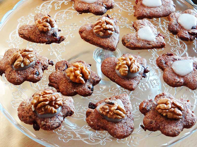 Ornăm biscuiții cu icing sugar și cu câte o jumătate de miez de nucă.