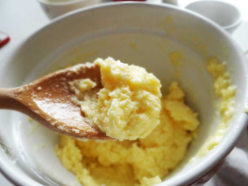 3. Amestecăm cu o lingură zahărul, untul și oul.