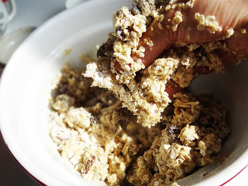 4. Încorporăm ingredientele umede în cele uscate cu ajutorul mâinii.