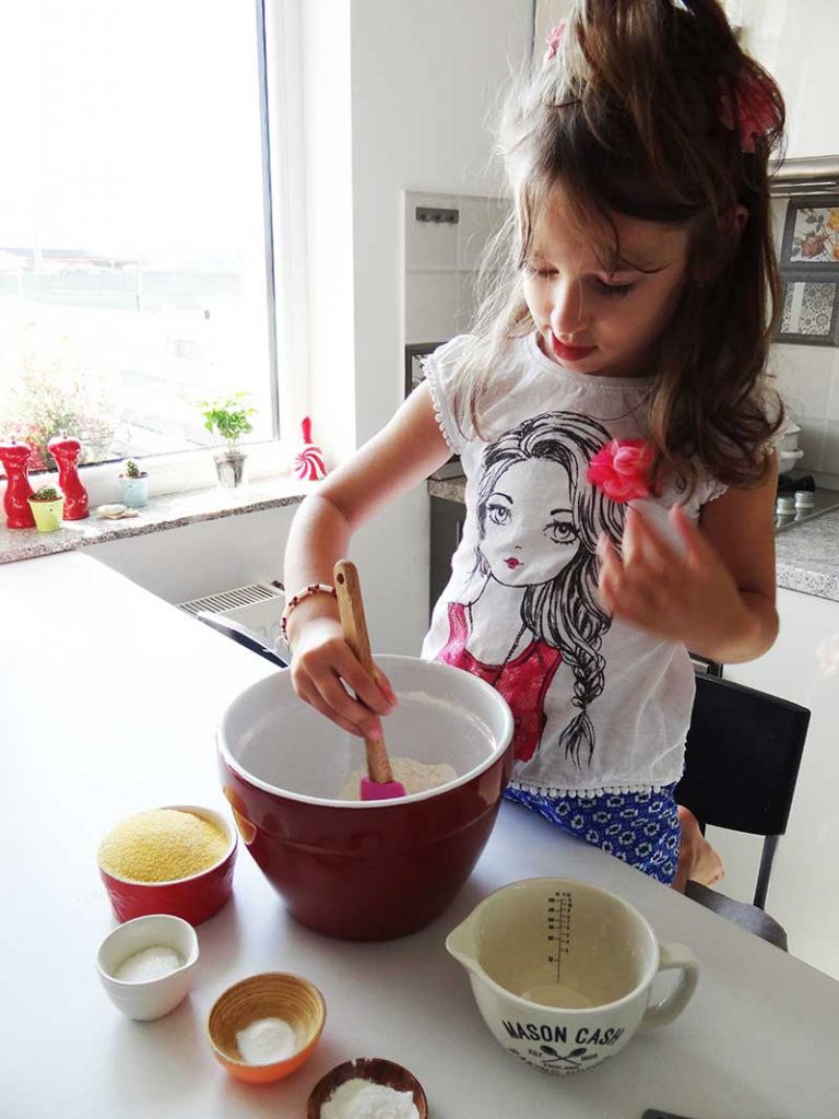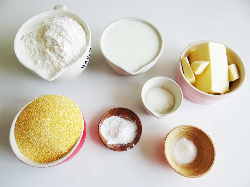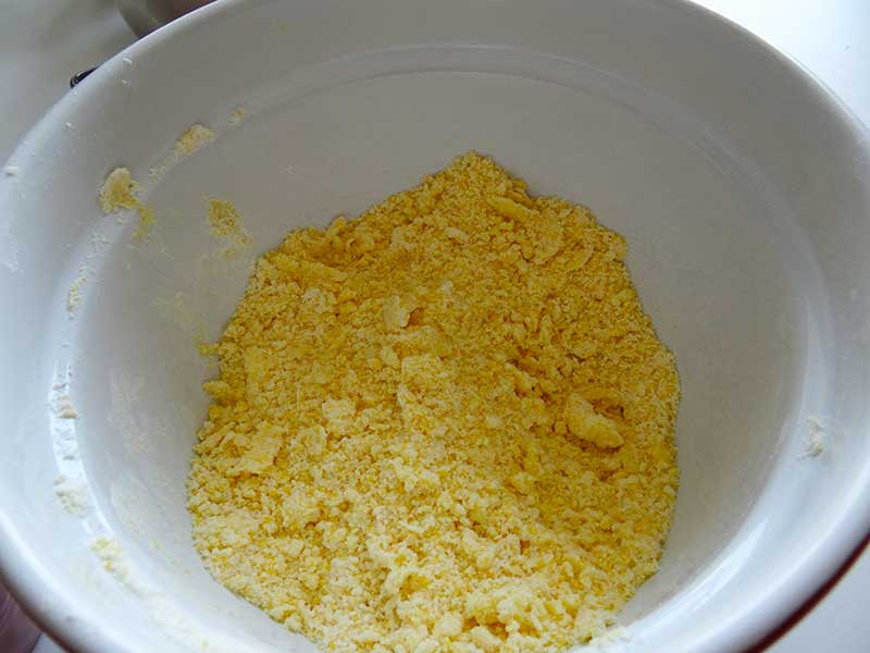 1. Combinăm toate ingredientele uscate: făina, mălaiul, praful de copt, zahărul, bicarbonatul de sodiu și sarea. În acest amestec încorporăm, cu vârful degetelor, untul. La final trebuie să obținem un amestec cu aspectul unor firimituri. Tot acum preâncălzim cuptorul la 180 grade C.