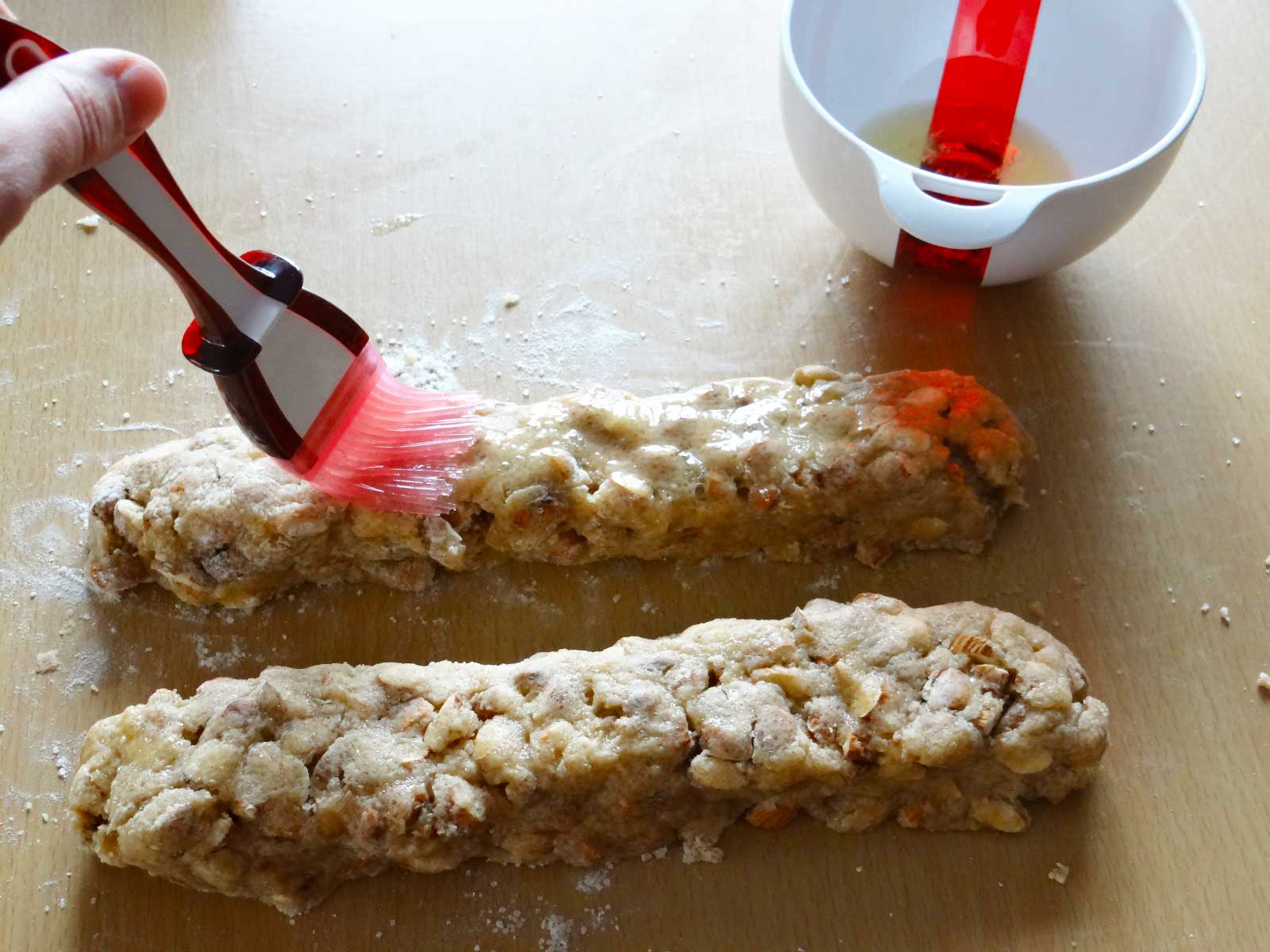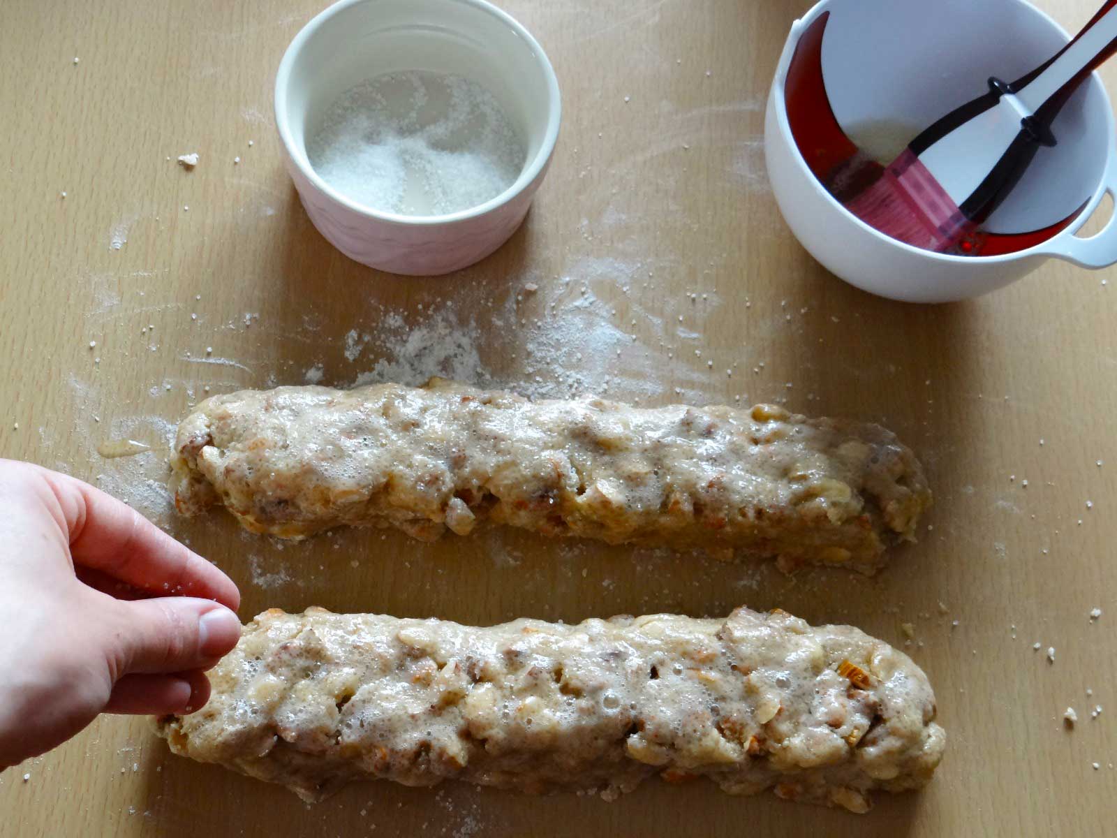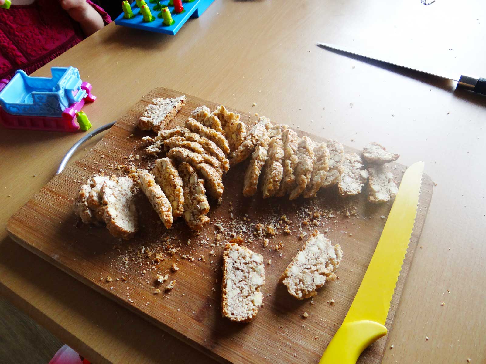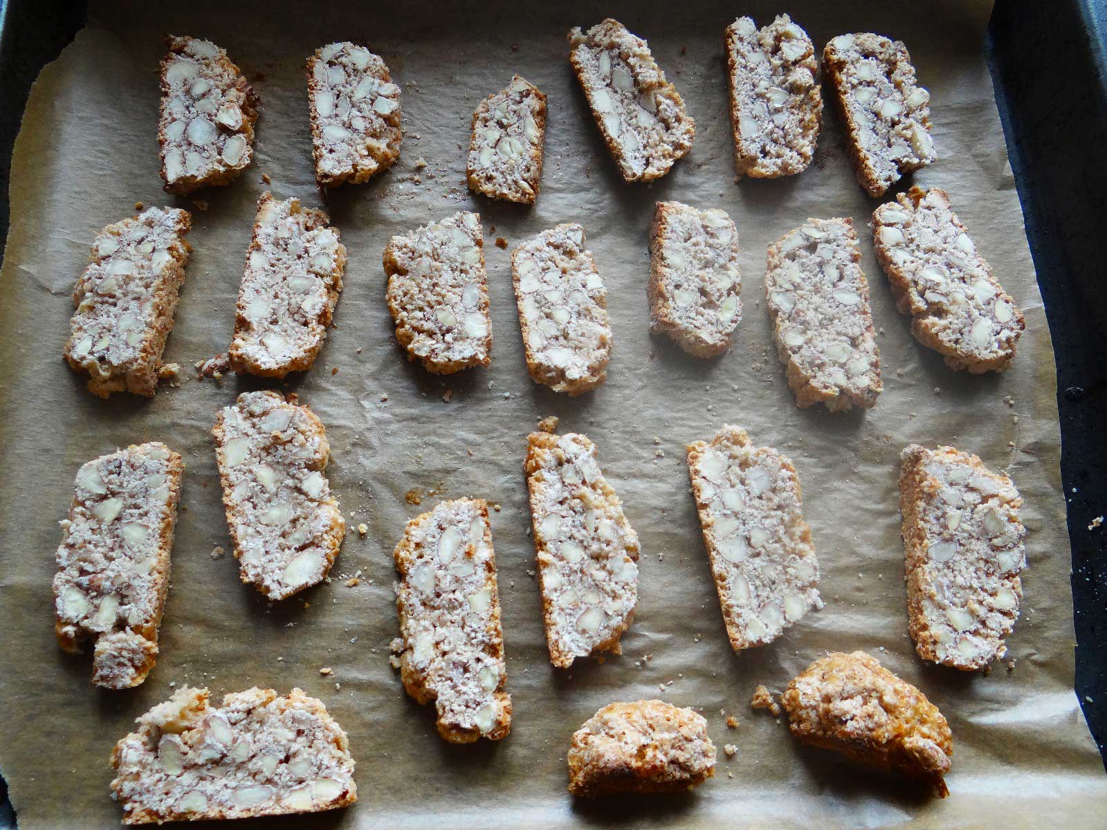 8. Dupa ce le scoatem din cuptor le lasam sa se raceasca 15 minute. Apoi  le taiem in felii cu o grosime de 1cm. Pentru a taia feliile veti avea nevoie de un cutit cu zimti.