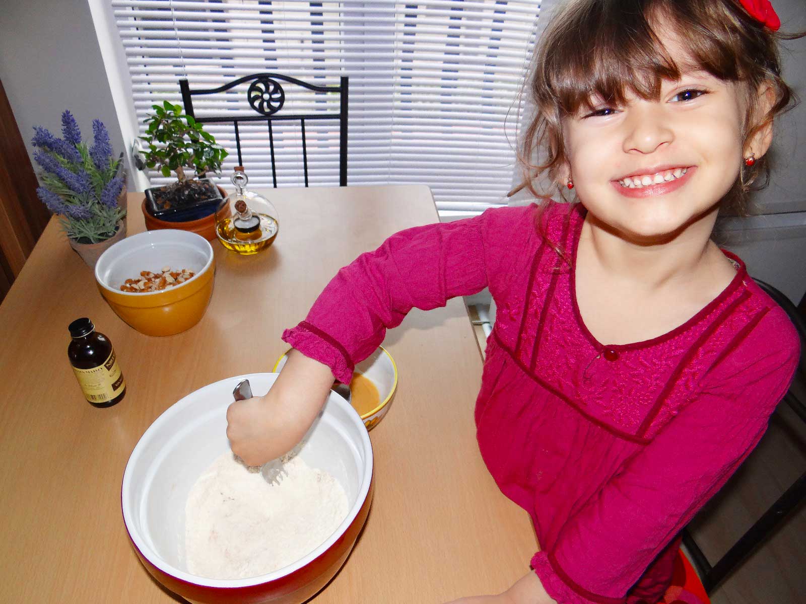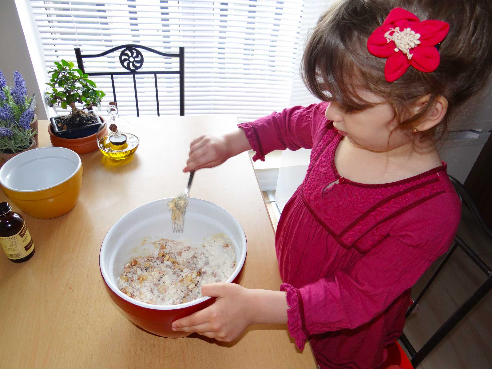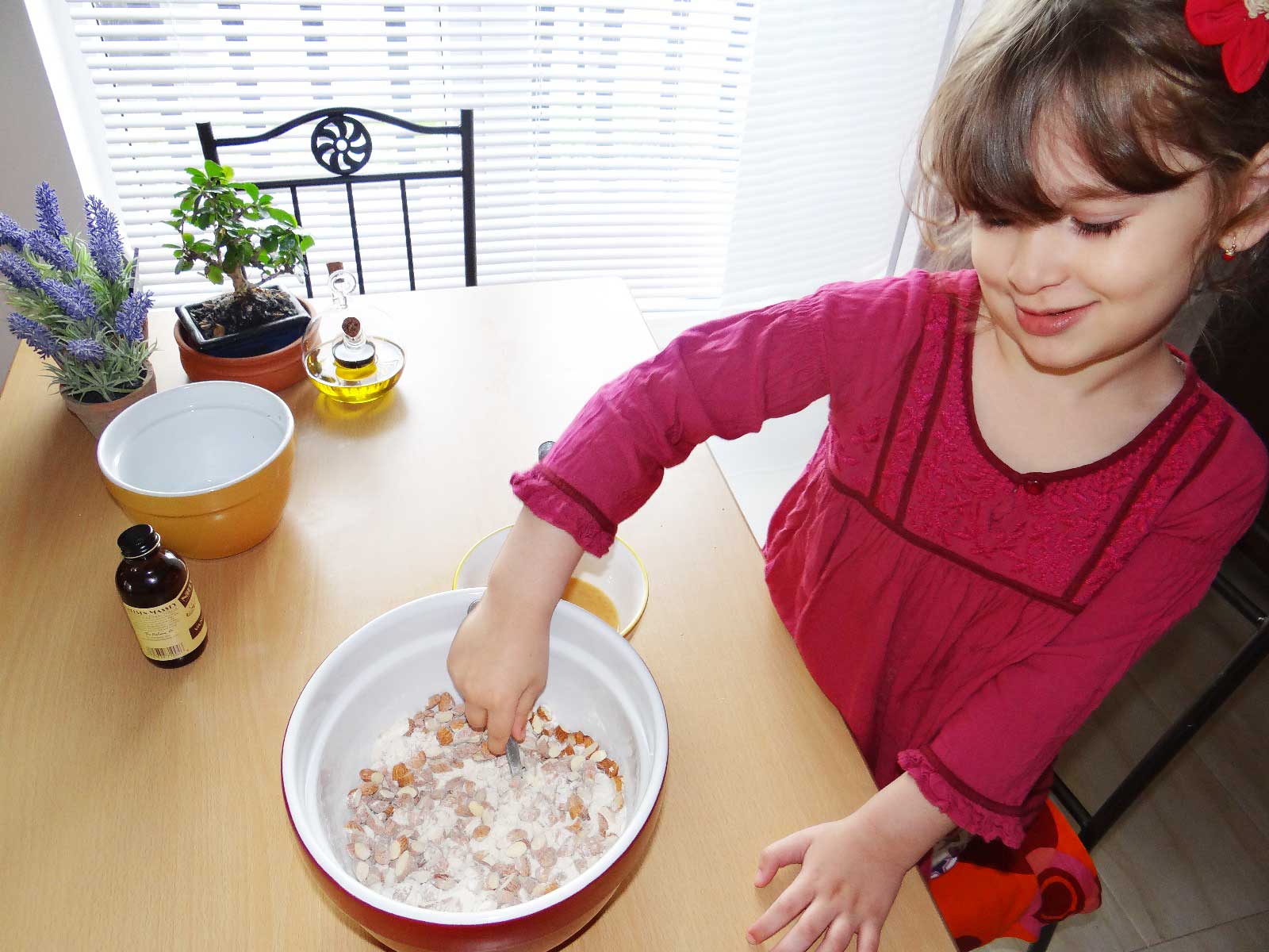 3. Intr-un bol incapator punem faina, zaharul, praful de copt, scortisoara si migdalele maruntite. Amestecam bine toate ingredientele uscate.
