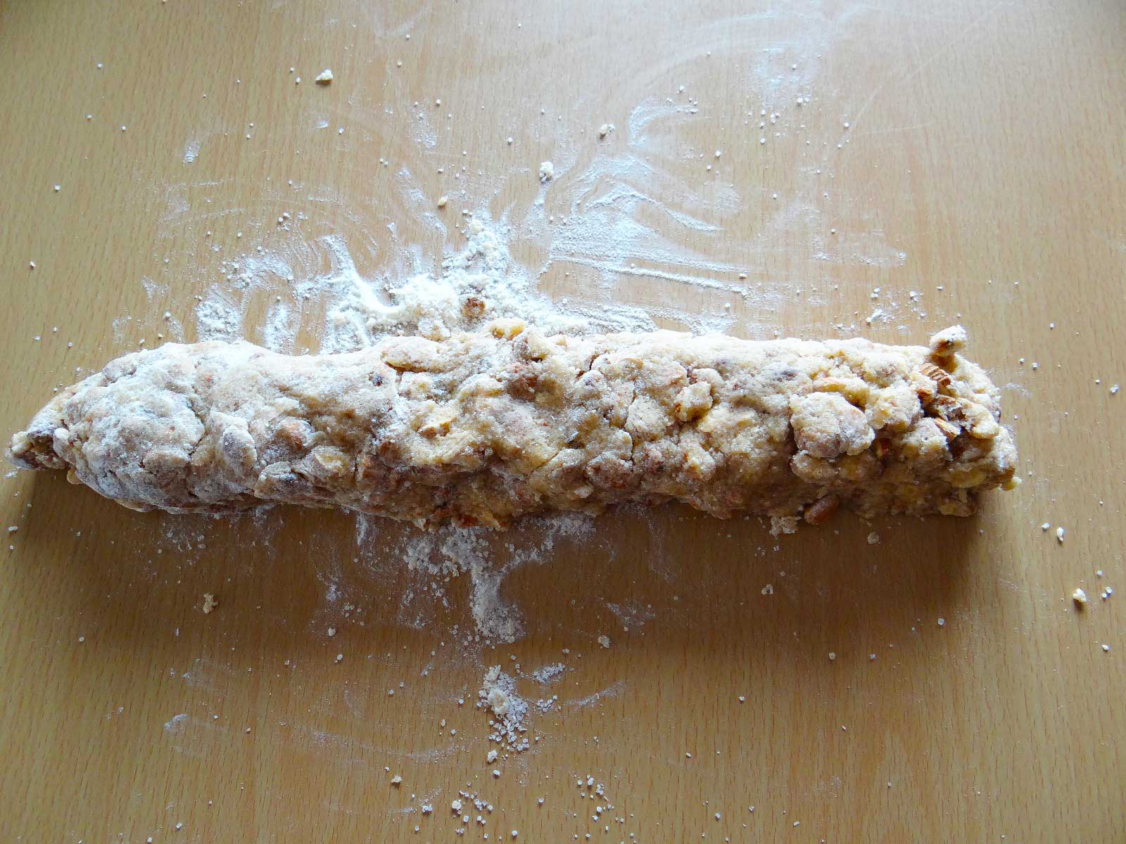 5. Punem aluatul pe masa de lucru  infainata si il framantam usor. Apoi il impartim in doua si formam din fiecare jumatate cate un rulou cu grosimea de 5cm.