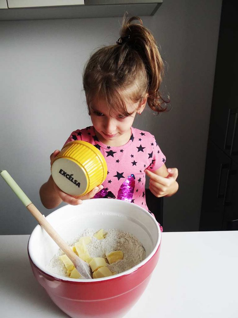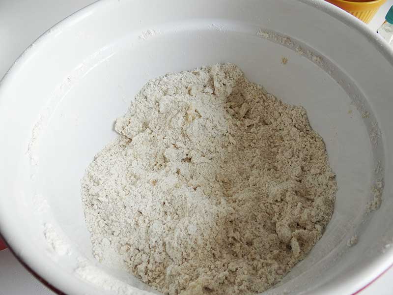 1. Combinăm făina cu zahărul, sarea și bicarbonatul de sodiu. Încorporăm untul cu vârful degetelor, la final trebuie să obținem un amestec cu aspectul unor firimituri.