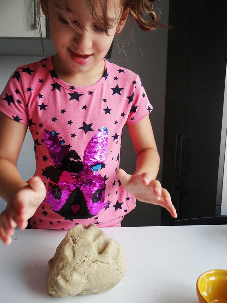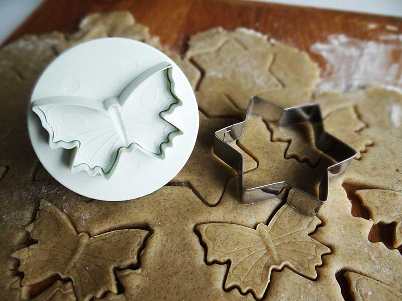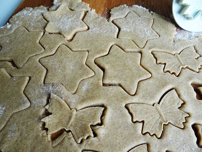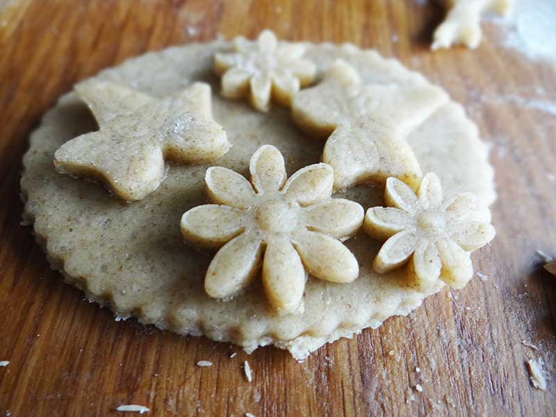 3. După acest timp pornim cuptorul la 180 grade C, scoatem aluatul și îl așezăm pe planul de lucru. Împărțim aluatul în două, o jumătate o introducem în frigider iar pe cealaltă o întindem cu sucitorul. Punem făină cât este nevoie iar grosimea foii trebuie să fie în jur de 3mm. Decupăm aluatul cu diverse forme, după preferință. Eu am folosit forme pentru fondant: stea, fluturaș, floricele, frunze. Am așezat pe o bucată de aluat ovală fluturași, flori, frunze. Le-am așezat pur și simplu, nu le-am lipit cu apă sau albuș.