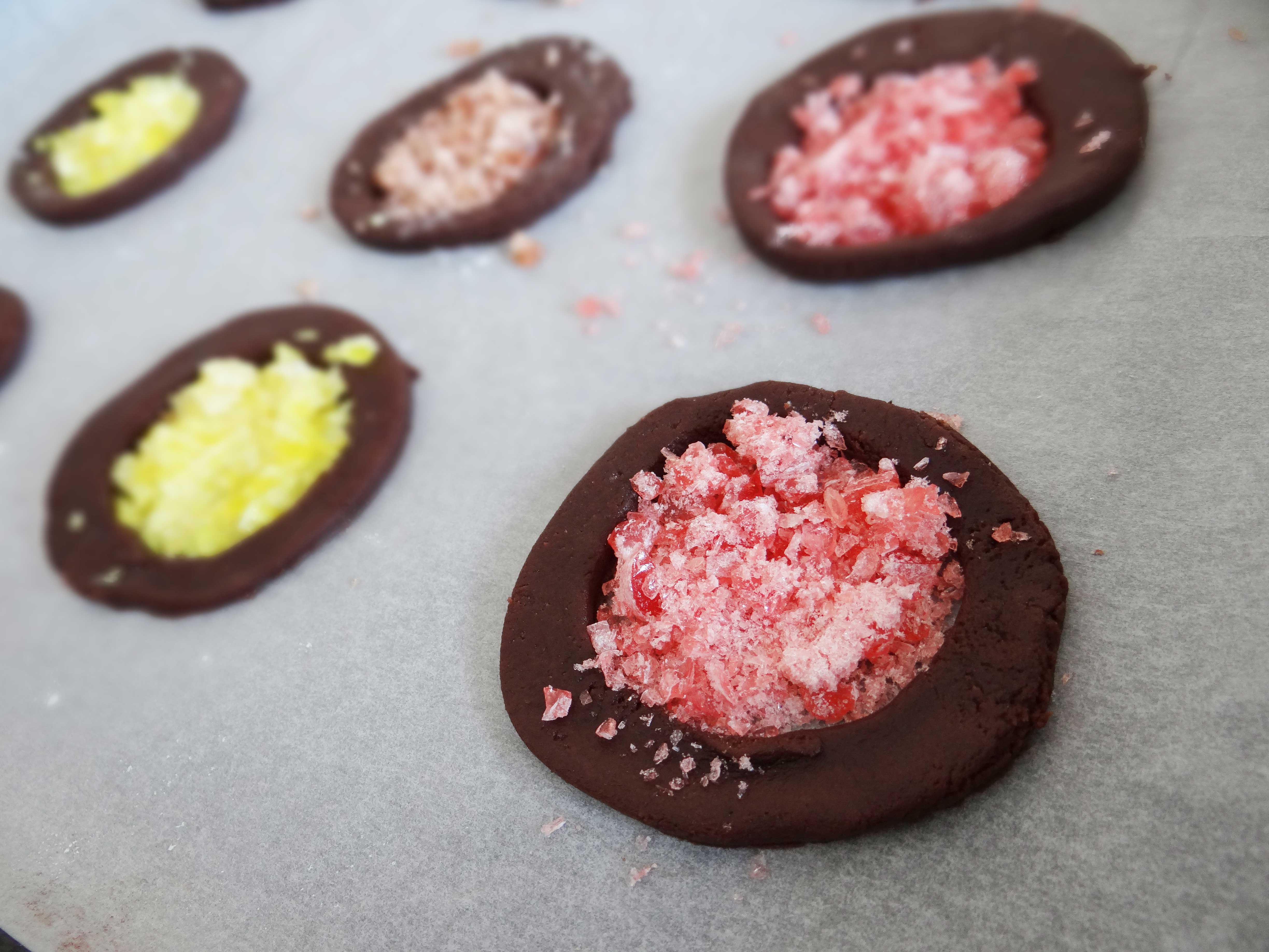 5. Umplem fiecare biscuite cu bomboane pisate.