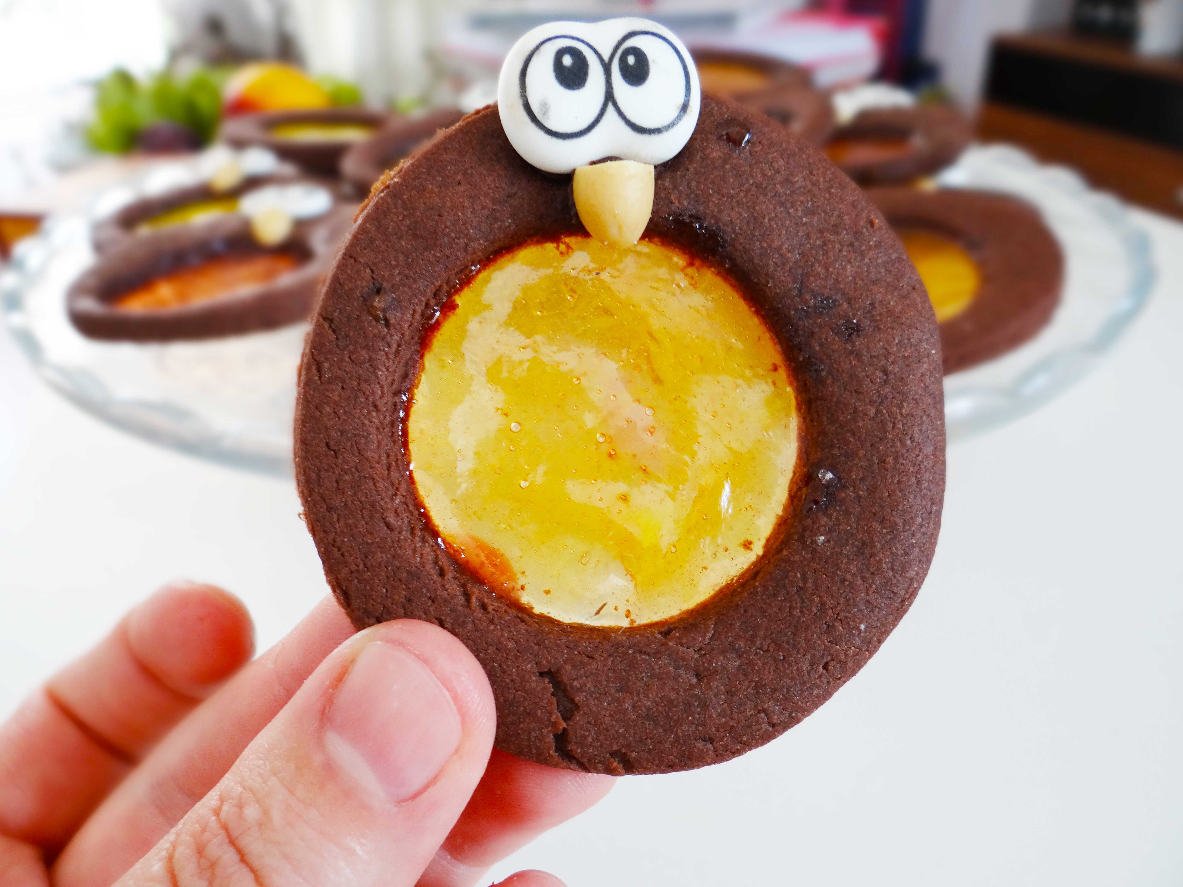 6. Introducem tava în cuptorul preîncălzit pentru 10 minute până când bomboanele sunt topite complet. Scoatem tava din cuptor și așezăm pe fiecare biscuite 2 cipsuri de ciocolată pentru ochi si unul pentru cioc.