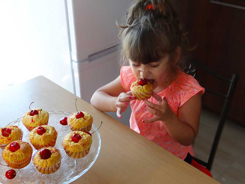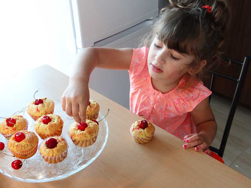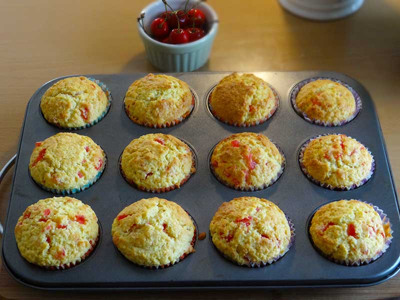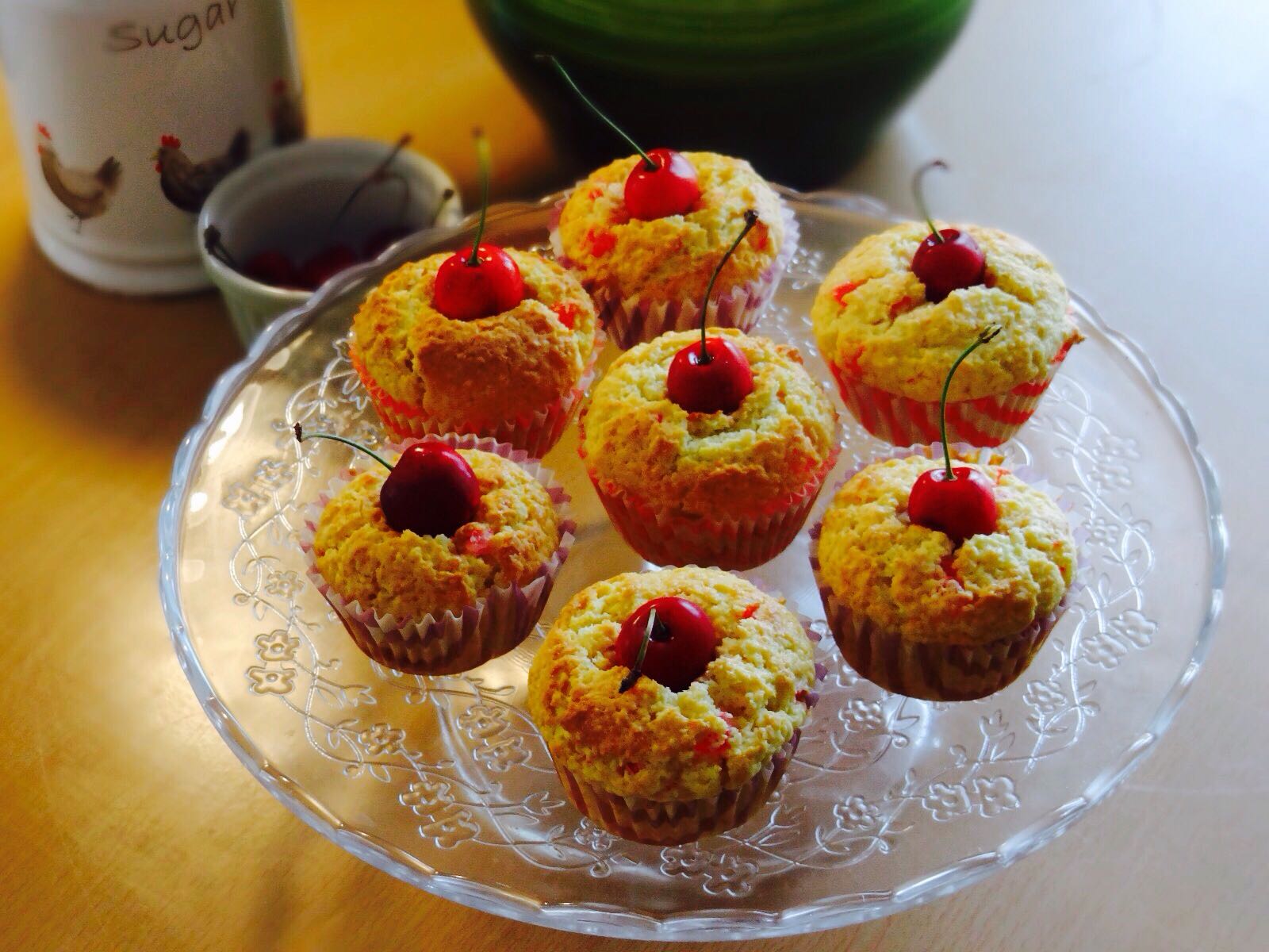12. Le mai ținem 5 minute în forme după care le scoatem și le lăsăm să se răcească. După ce s-au răcit le ornăm cu câte o cireașă, pe care o presăm ușor în aluat.