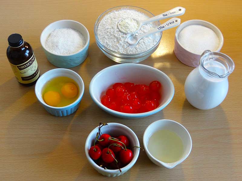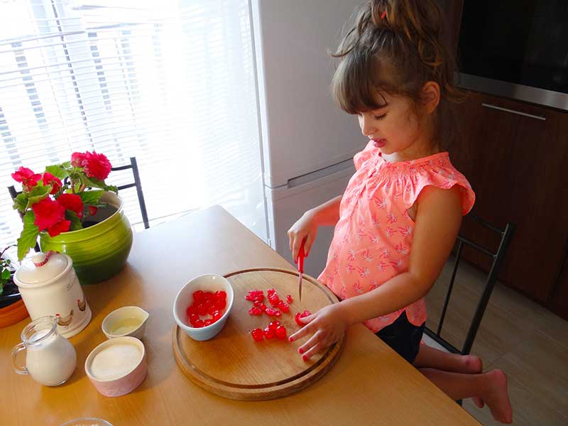 4. Adăugăm zahărul, nuca de cocos răzuită și cireșele glasate tăiate.