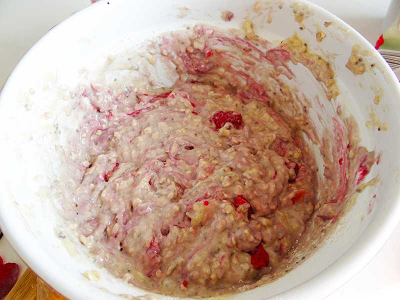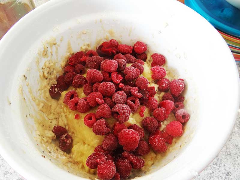 Apoi adăugăm fructele pe care le încorporăm cu o spatulă prin mișcări ușoare de jos în sus.