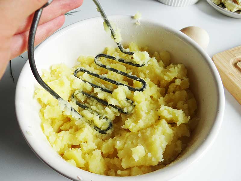 1. Curățăm cartofii, îi tăiem în bucăți mici după care îi punem la fiert. După ce au fiert îi pasăm până când obținem un piure fin. Preâncălzim cuptorul la 180 grade C.