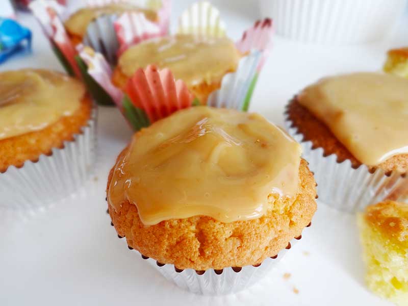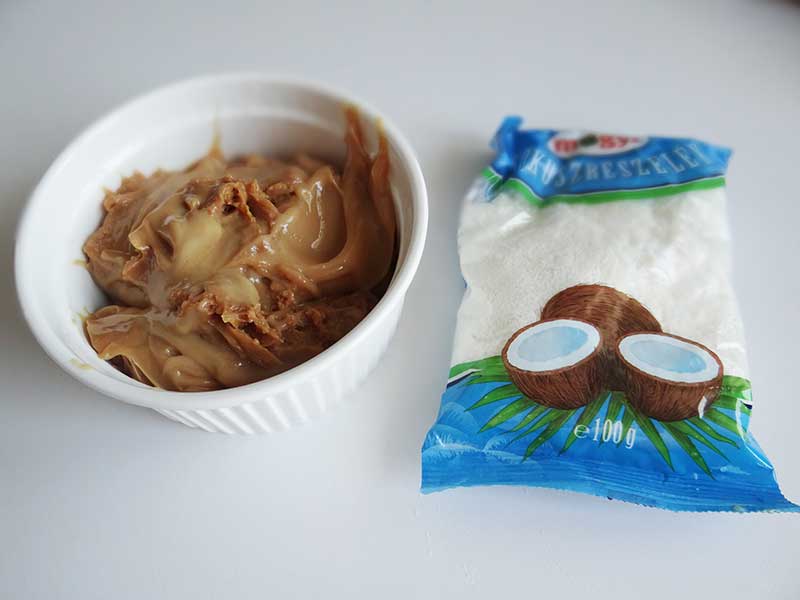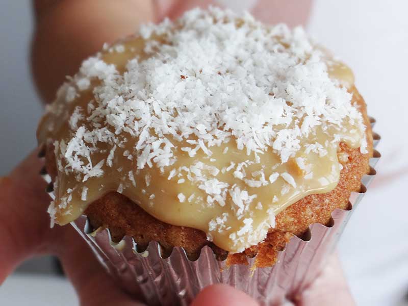 8. Umplem brioșele răcite cu dulce de leche. Cu ajutorul unei lingurițe scobim interiorul brioșelor după care le umplem cu acest caramel delicios. Deasupra presărăm nucă de cocos răzuită.
