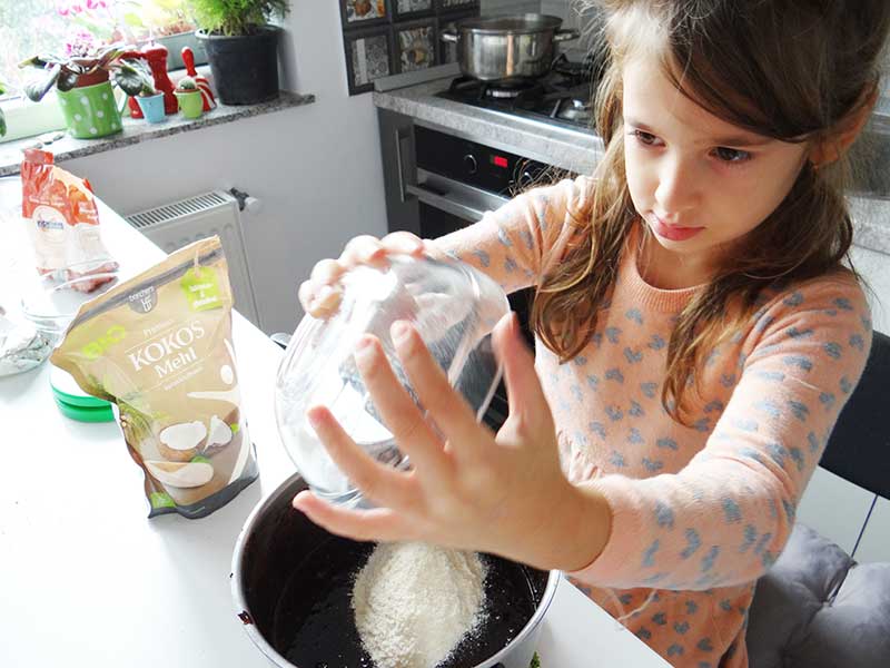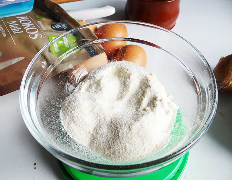 2. Cernem făina de cocos împreună cu praful de cocos.