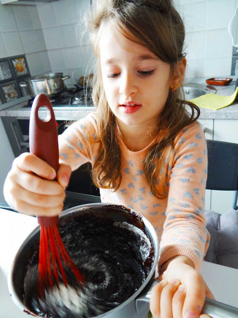 4. Peste amestecul de unt și cacao adăugăm zahărul, sarea, vanilia și cele 6 ouă. Amestecăm bine cu un tel.