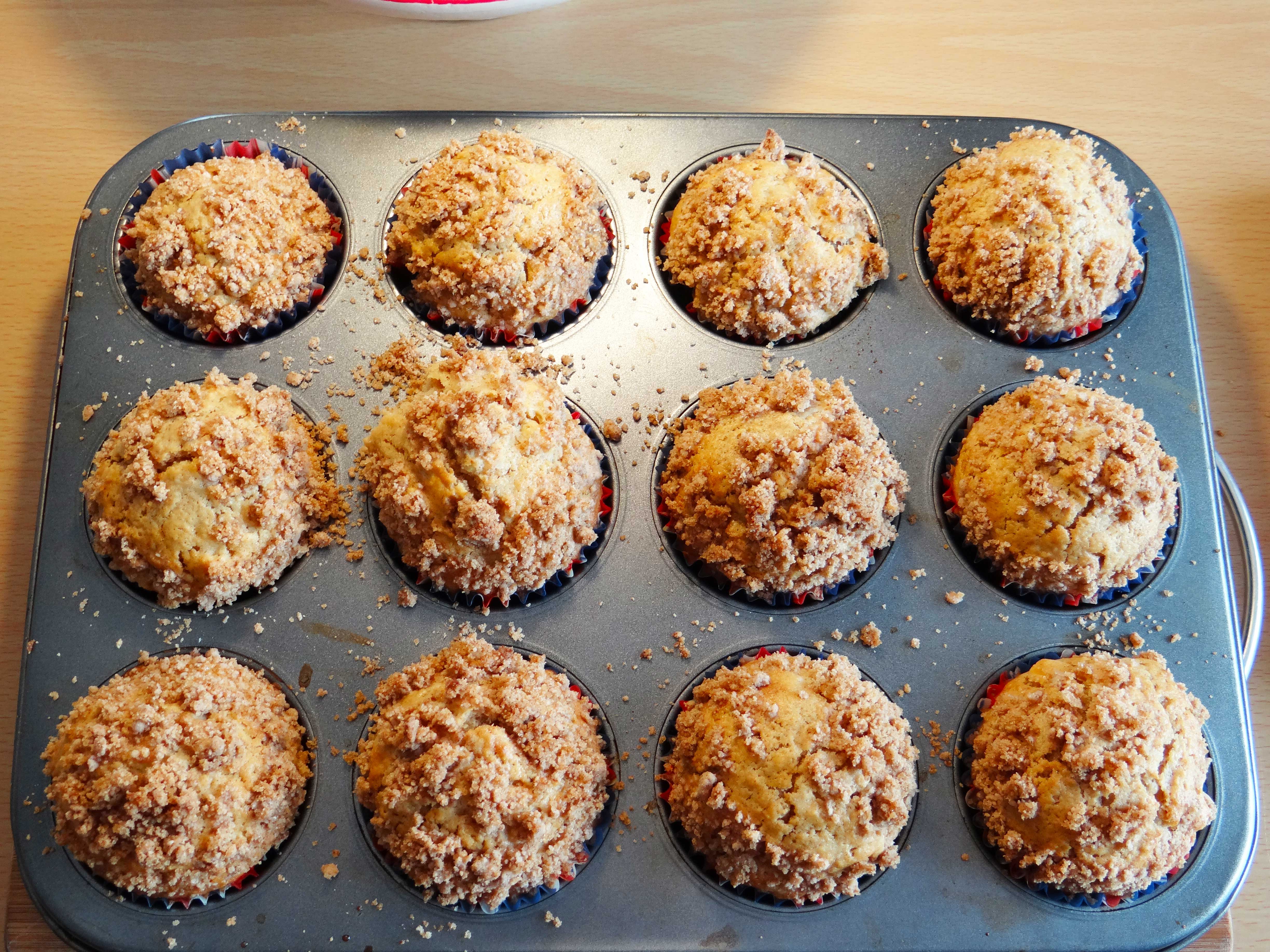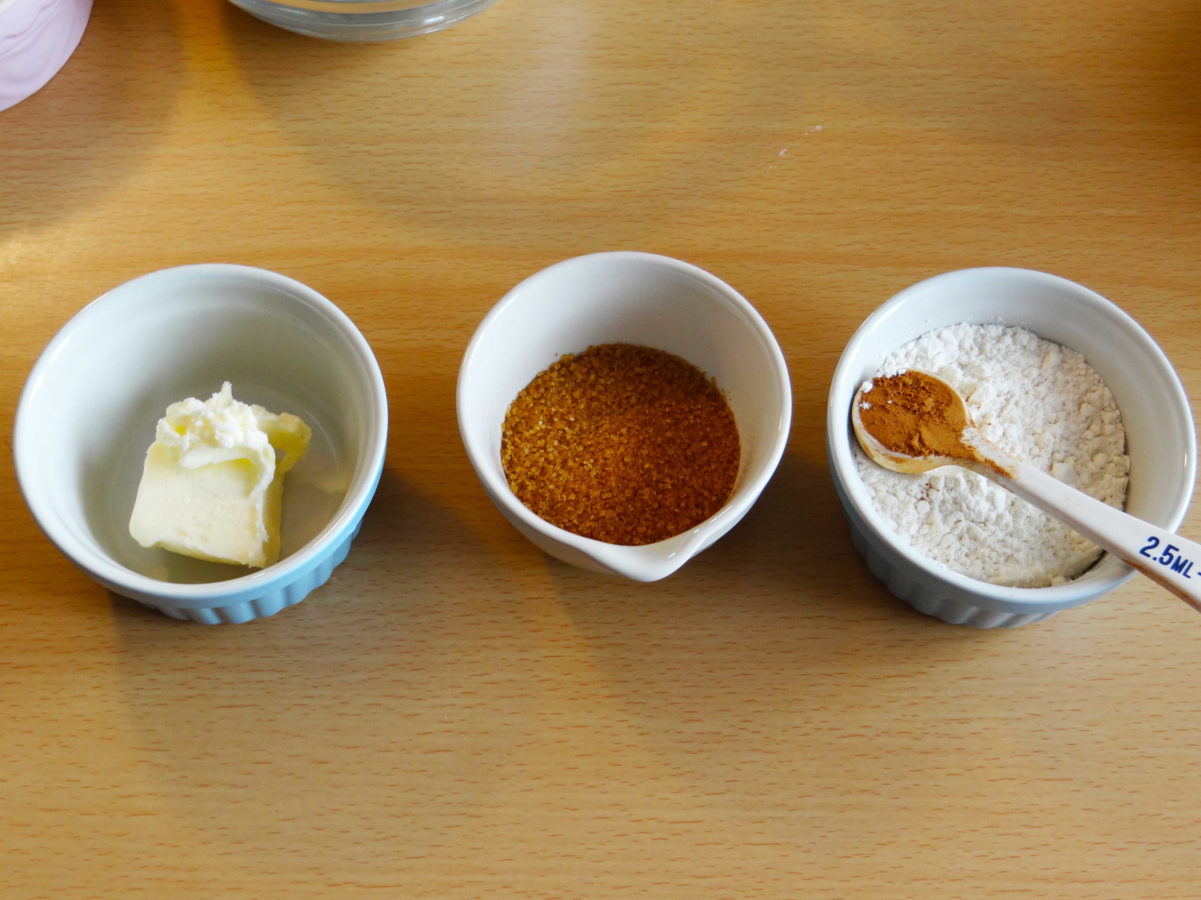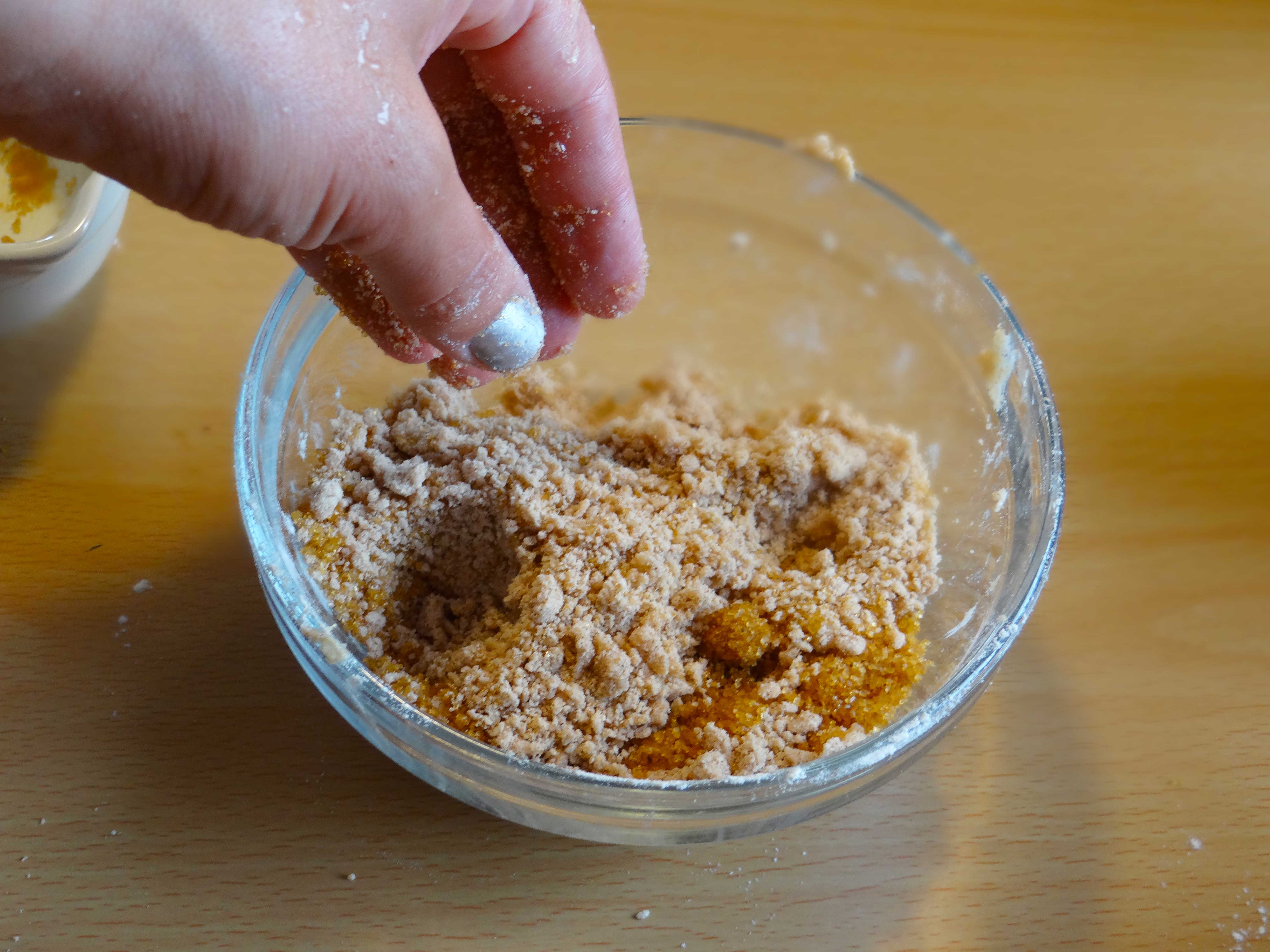 2. Pentru prepararea toppingului  punem intr-un bol faina impreuna cu scortisoara. Adaugam untul taiat cubulete si cu varful degetelor incorporam untul pana cand compozitia capata aspectul unor firimituri.