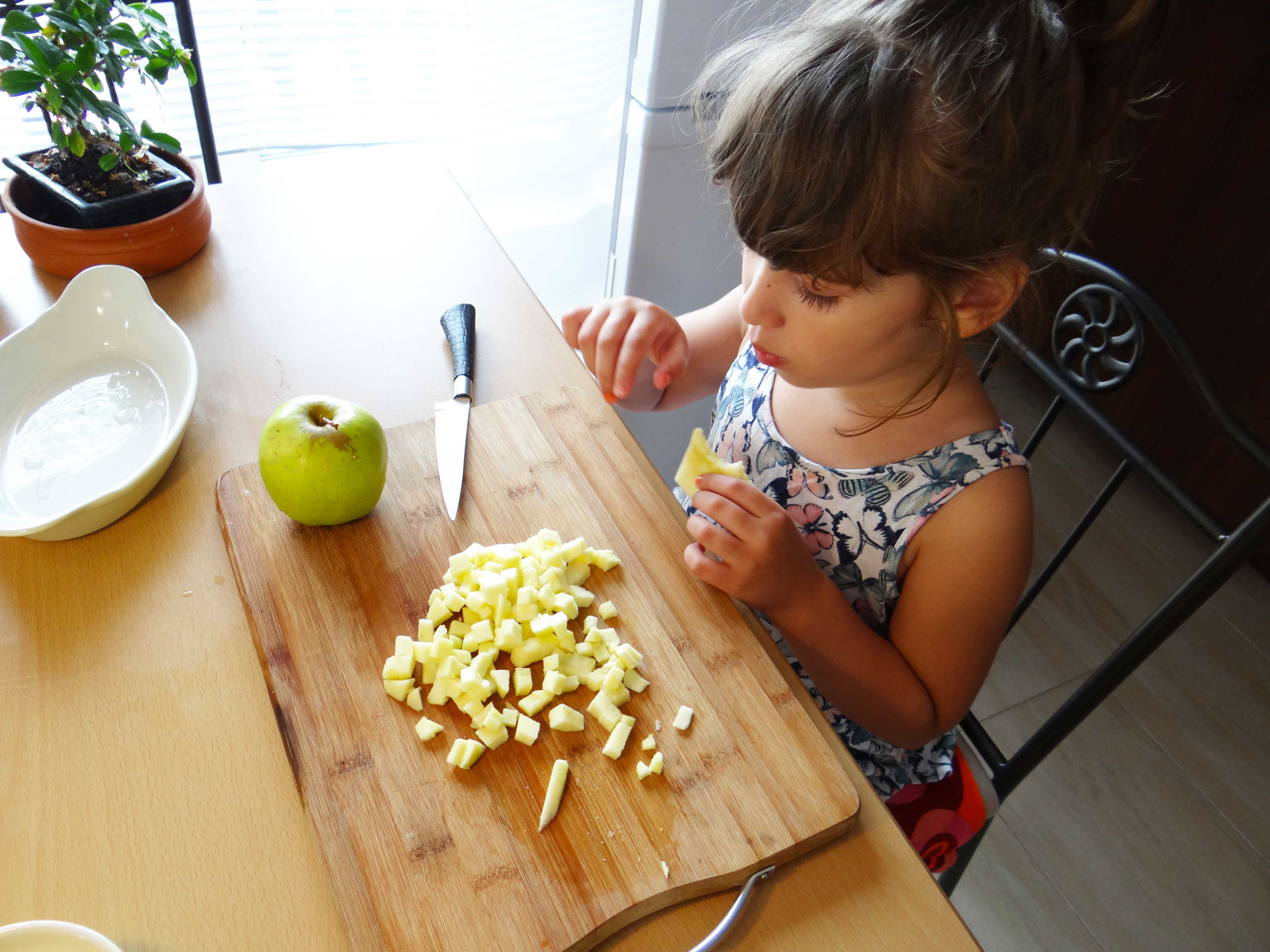 5. Adaugam zaharul si merele taiate cubulete. Amestecam bine.