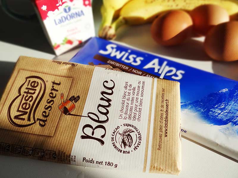 2. Pasăm bananele cu o furculiță după care adăugăm ouăle și zahărul. Mixăm bine, apoi adăugăm uleiul, apa și laptele bătut.
