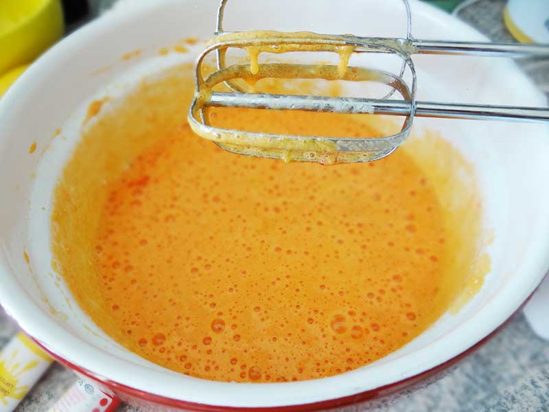 4. Adăugăm treptat amestecul uscat peste cel umed. Omogenizăm amestecul cu un tel. La sfârșit adăugăm și coloranții, 5 picături de roșu și vreo 3 de galben.
