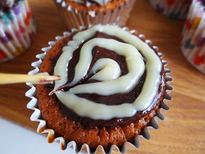 Cu o linguriță punem ciocoltă neagră pe suprafața brioșei iar cu un poș, în care punem ciocolata albă, facem cerculețe pe suprafața acesteia. Cu o scobitoare trasăm linii fine pentru a obține aspectul de pânză de păianjen.