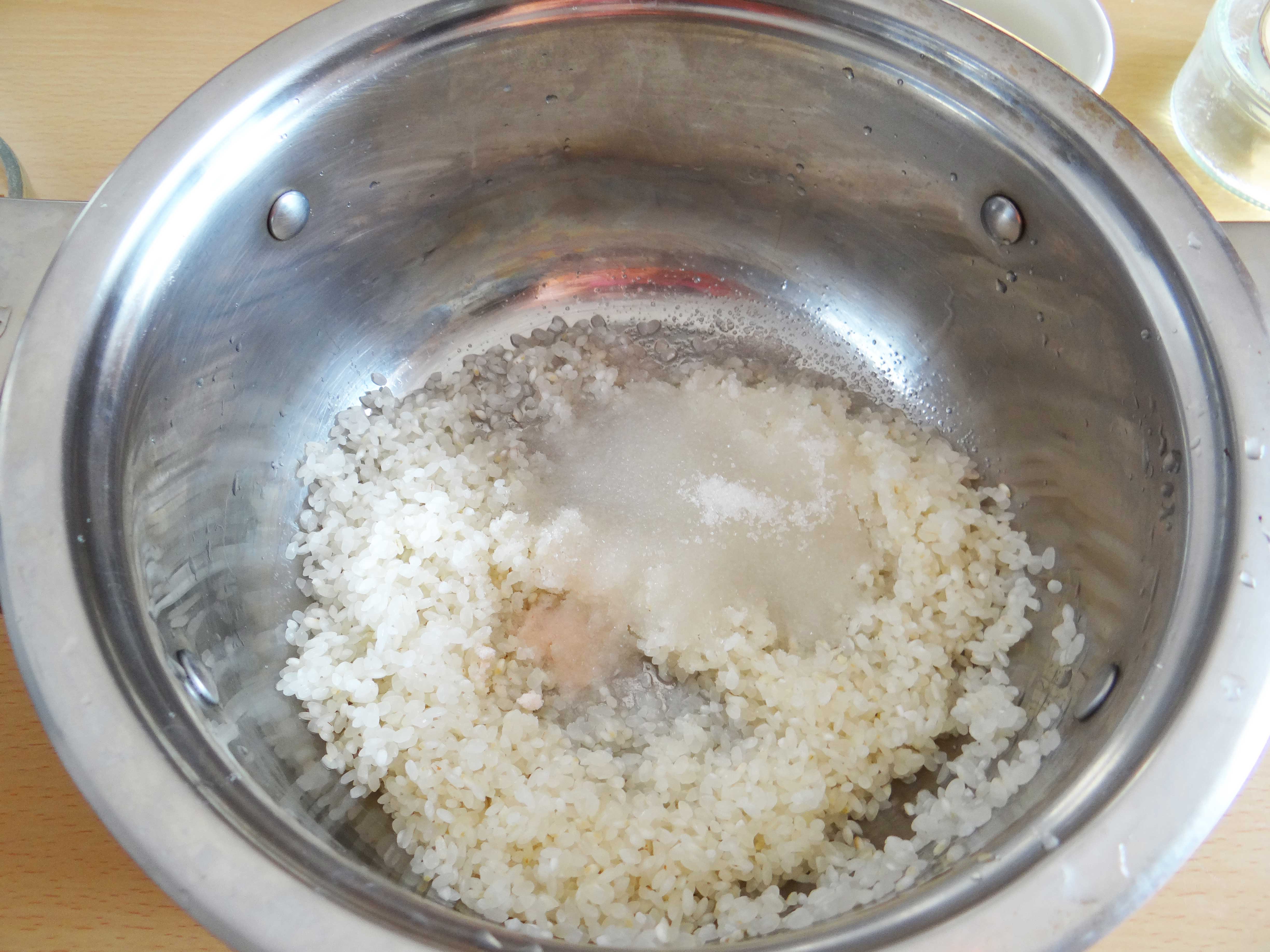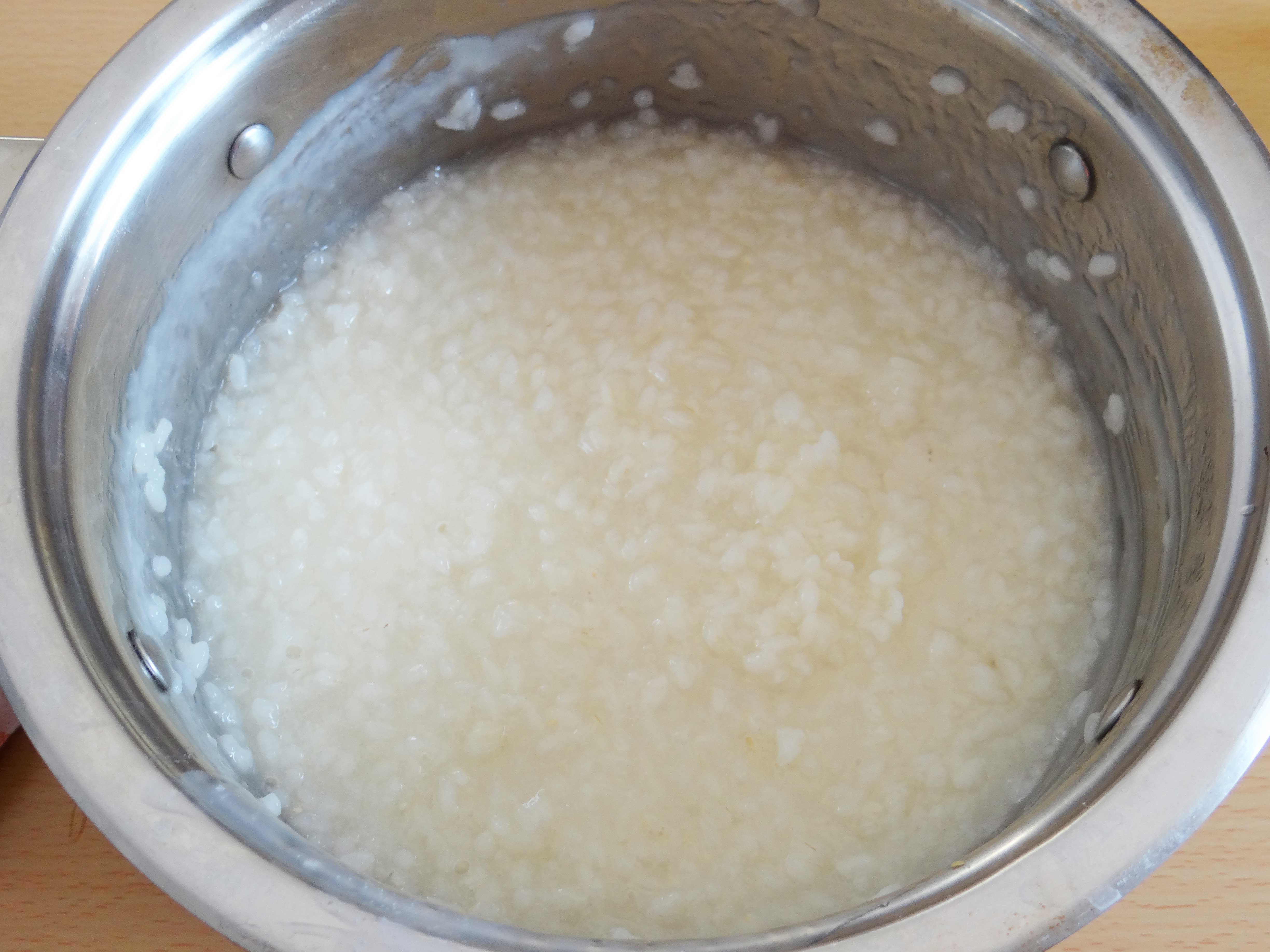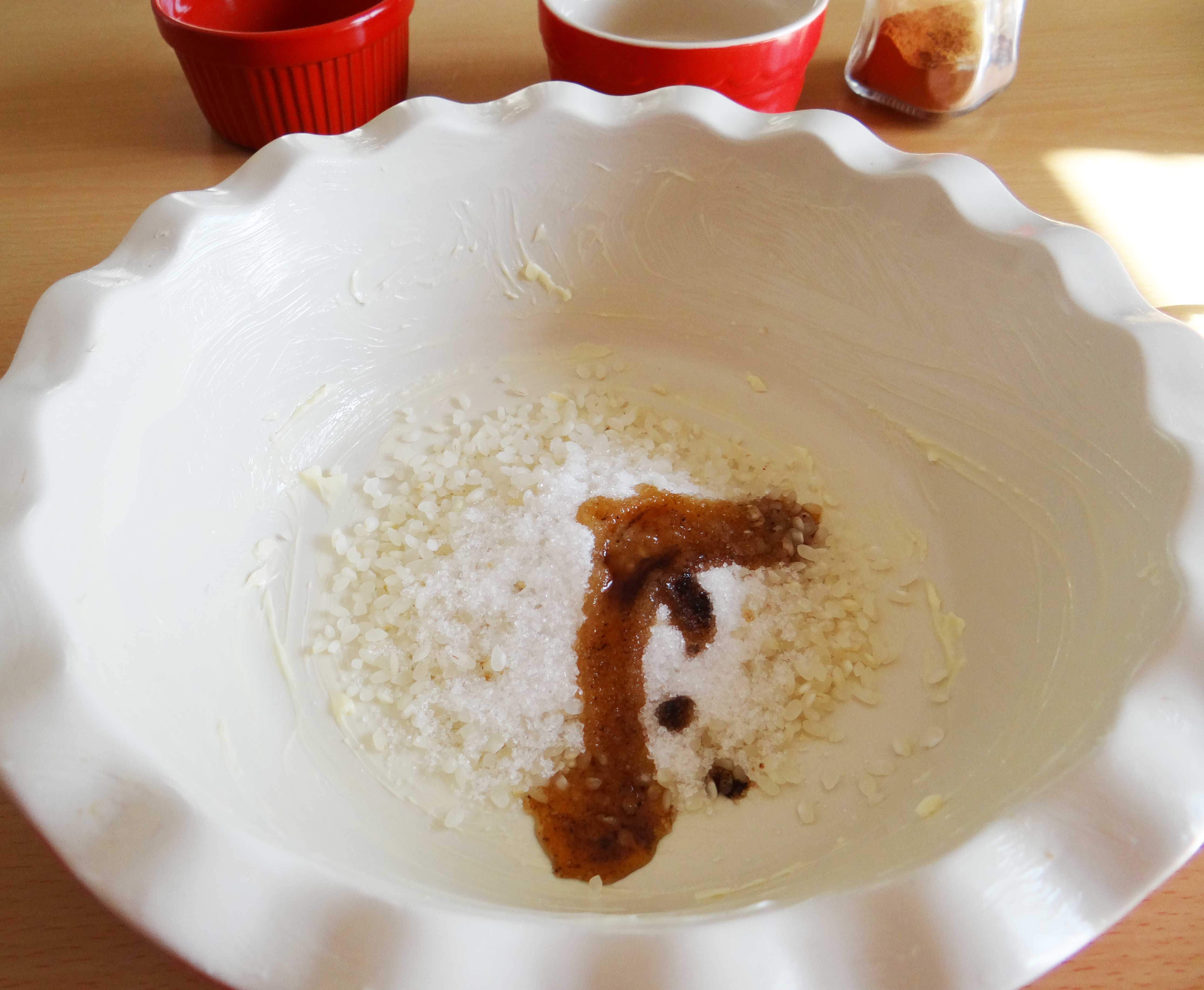 1. Spălăm orezul în câteva ape după care îl punem la fiert împreună cu două căni și jumătate de apă, cu zahărul tos și sarea. Îl ținem pe foc până cand acesta se înmoaie și apa este absorbită.