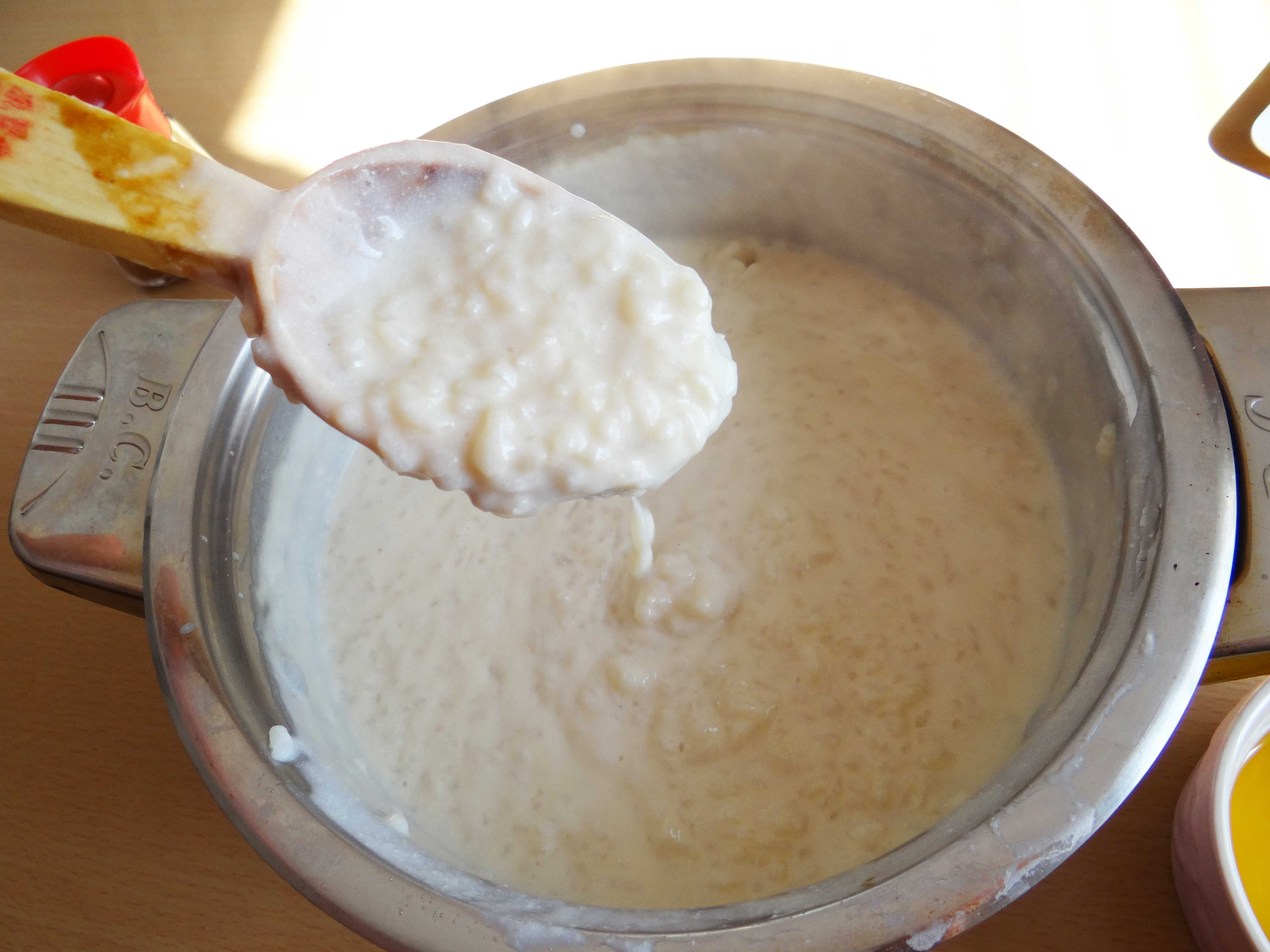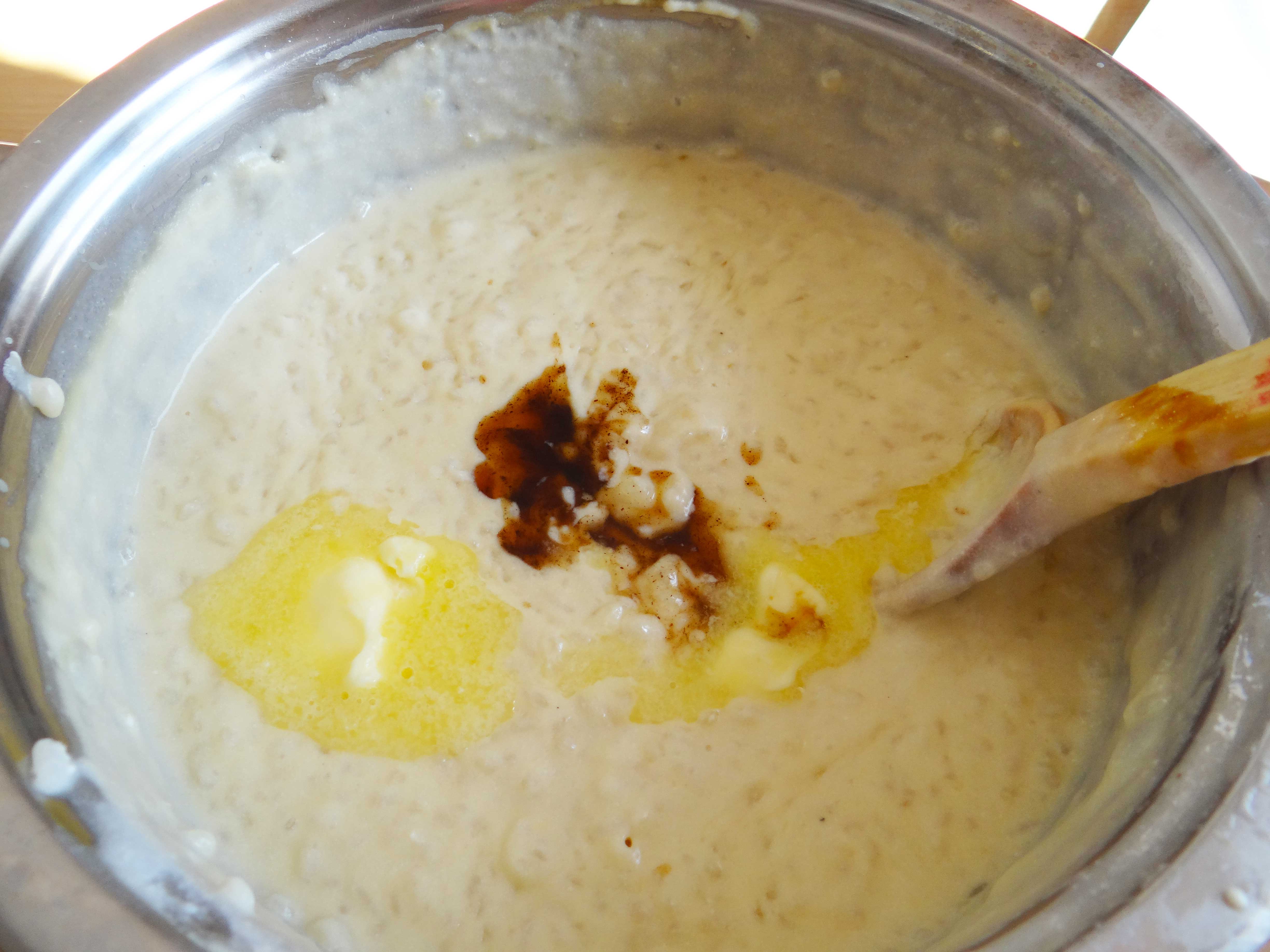 5. Adăugăm gălbenușurile în oala cu orez, împreună cu o jumătate de cană de lapte și mai lăsăm totul să fiarbă până când compoziția se îngroașă din nou(cam 3-5 minute). După ce oprim focul adăugăm untul și vanilia.