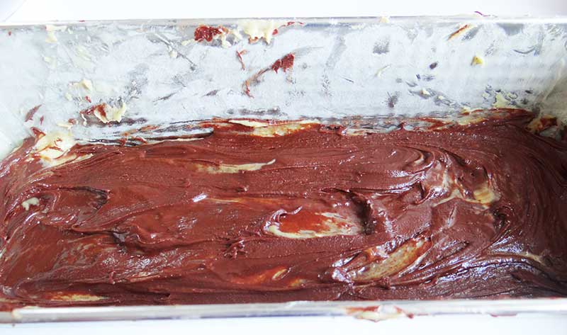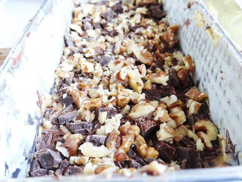 4. Ungem cu unt și pudrăm cu făină o formă pentru cozonac. Adăugăm un prim strat de aluat(un sfert din cantitatea totală) urmeazăun stratul de ciocolată(cantitatea de ciocolată o împărțim în 3), iar un strat de aluat și unul de ciocolată. În total sunt 4 straturi de aluat și trei de ciocolată. Ultimul strat este de aluat iar deasupra lui presărăm 100g de ciocolată tăiată în bucăți mari.