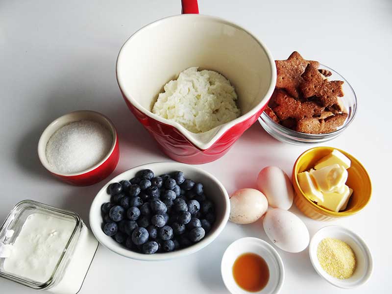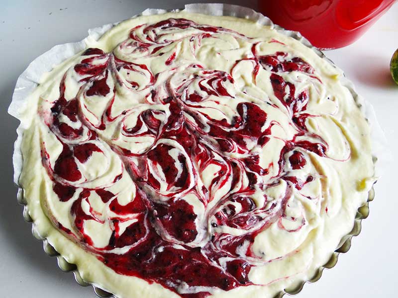 5. Așezăm crema peste biscuiți iar apoi, din loc în loc, punem piureul de afine. Cu un cuțit trecem prin toate zonele cu piure obținând astfel acest aspect interesant.