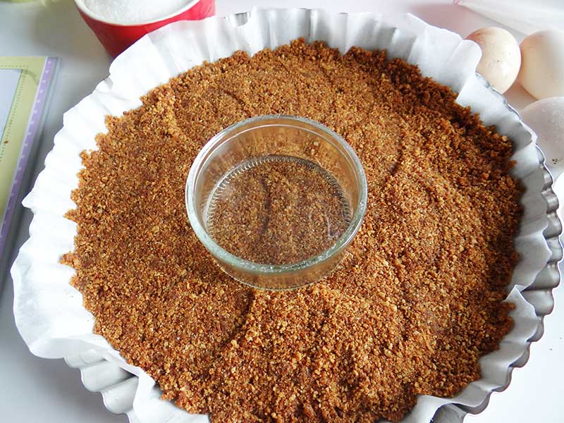 1. Pentru început trebuie să facem baza cheesecake-ului și pentru aceasta trebuie să mărunțim fin biscuiții digestivi cu ajutorul robotului de bucătărie. Amestecăm biscuiții cu untul topit după care îi punem într-o tavă unsă cu unt și tapetată cu hârtie de copt. Eu am folosit o formă de tartă cu diametrul de 23cm dar puteți să fălosiți și o formâ dreptunghiulară cu dimensiunea de 28X18cm.