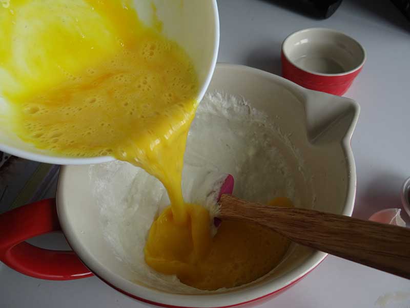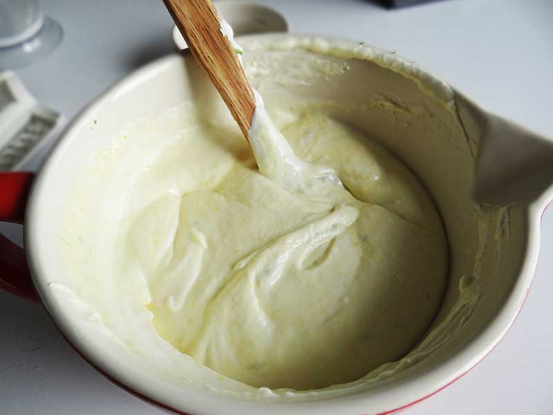 3. Amestecăm brânza cu zahărul și vanilia până când obținem un amestec fin. Gradat adăugăm ouăle bătute după care încorporăm frișca bătută, amidonul și coaja de limetă.
