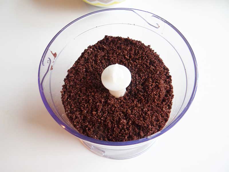 1. Mai întâi facem crusta. Cu ajutorul unui robot de bucătarie mărunțim biscuiții oreo.