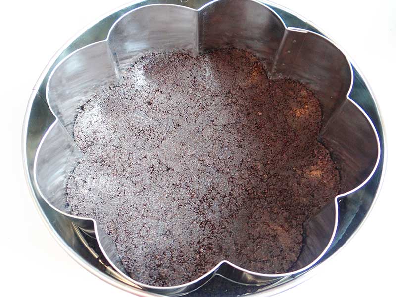 2. Amestecăm biscuiții mărunțiți cu untul topit. Punem tot amestecul într-o tavă cu diametrul de 21cm. Nivelăm crusta cu ajutorul unei linguri și apoi o dăm la frigider.