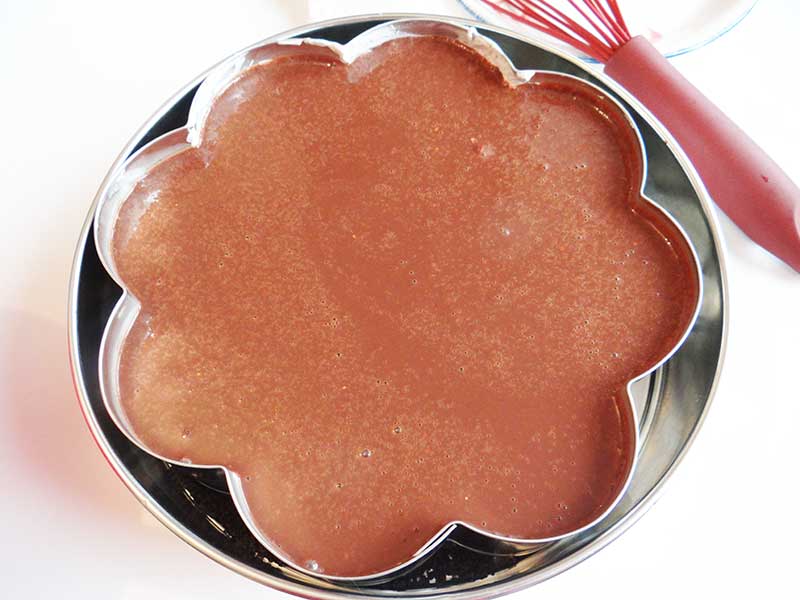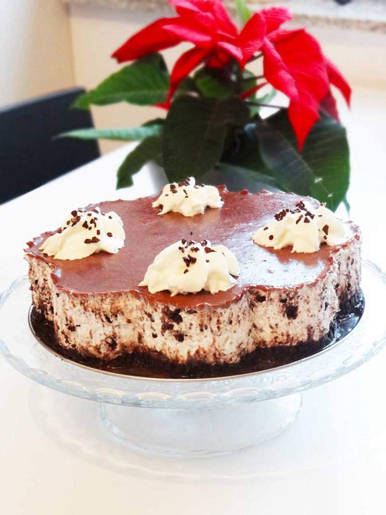 9. Amestecăm ganache-ul cu un tel, îl lăsăm la răcit, după care îl turnăm peste cheesecake.