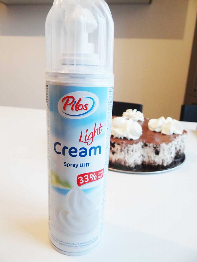 Pentru decor am folosit frișcă la tub de la Pilos. Vă recomand să o folosiți și voi doar în momentul când serviți tortul deoarece aceasta nu își păstrează forma mult timp.