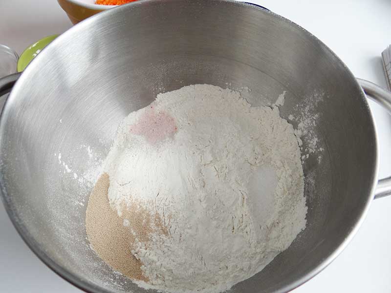 1. Combinăm făina cu zahărul, sarea și drojdia(nu adăugați drojdia peste sare).