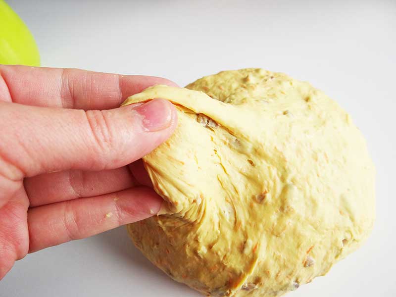 2. Frământăm aluatul, fie cu mâna fie cu robotul de bucătărie. La final trebuie să obținem un aluat elastic și foarte puțin lipicios.