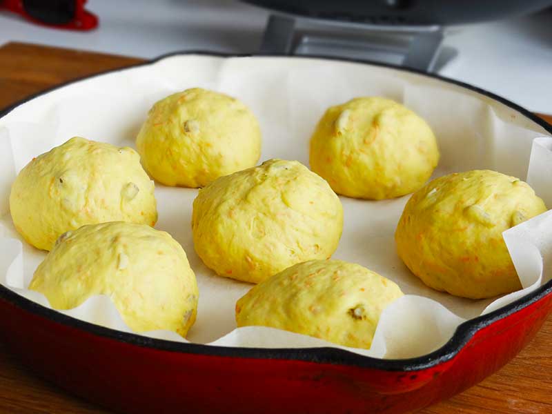 Împărțim aluatul în 12 părți egale. Dăm fiecărei bucăți de aluat o formă rotundă.