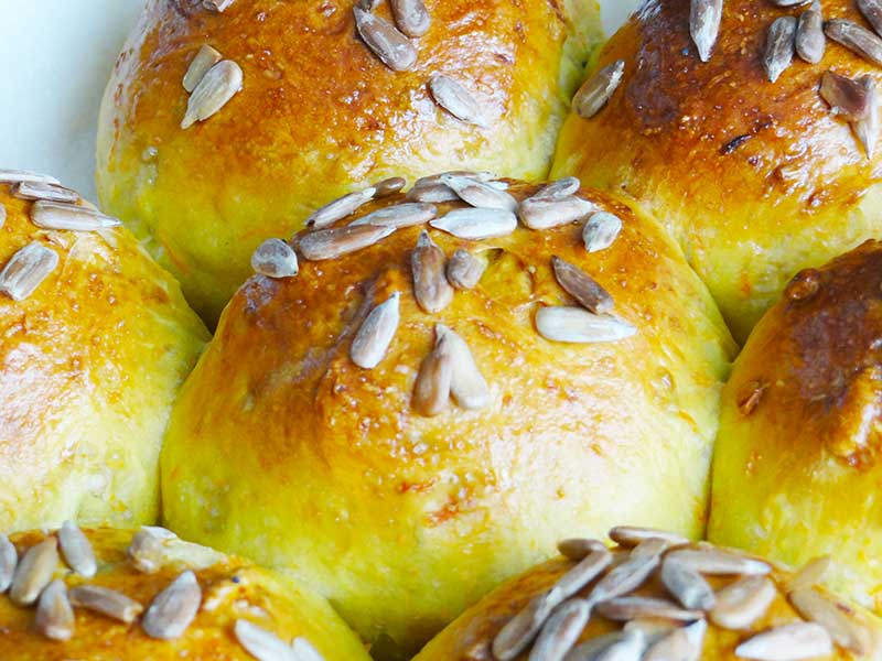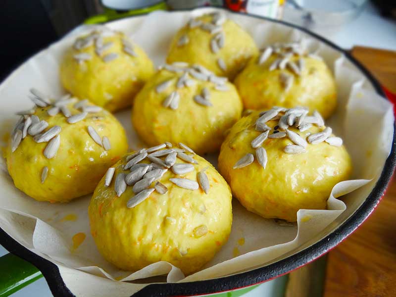 6. După ce a expirat timpul, ungem chiflele cu ou bătut și presărăm căteva semințe de floarea soarelui.