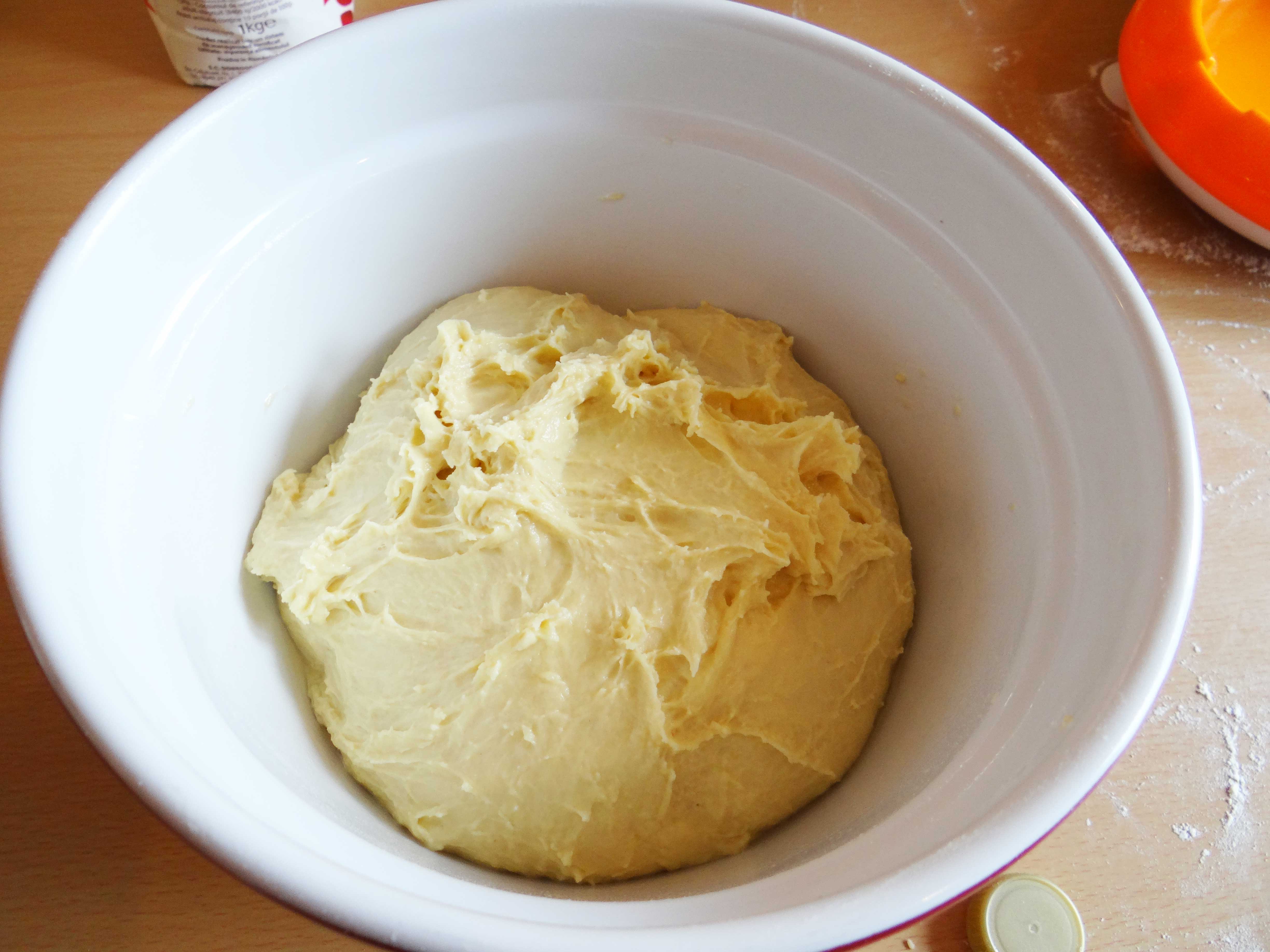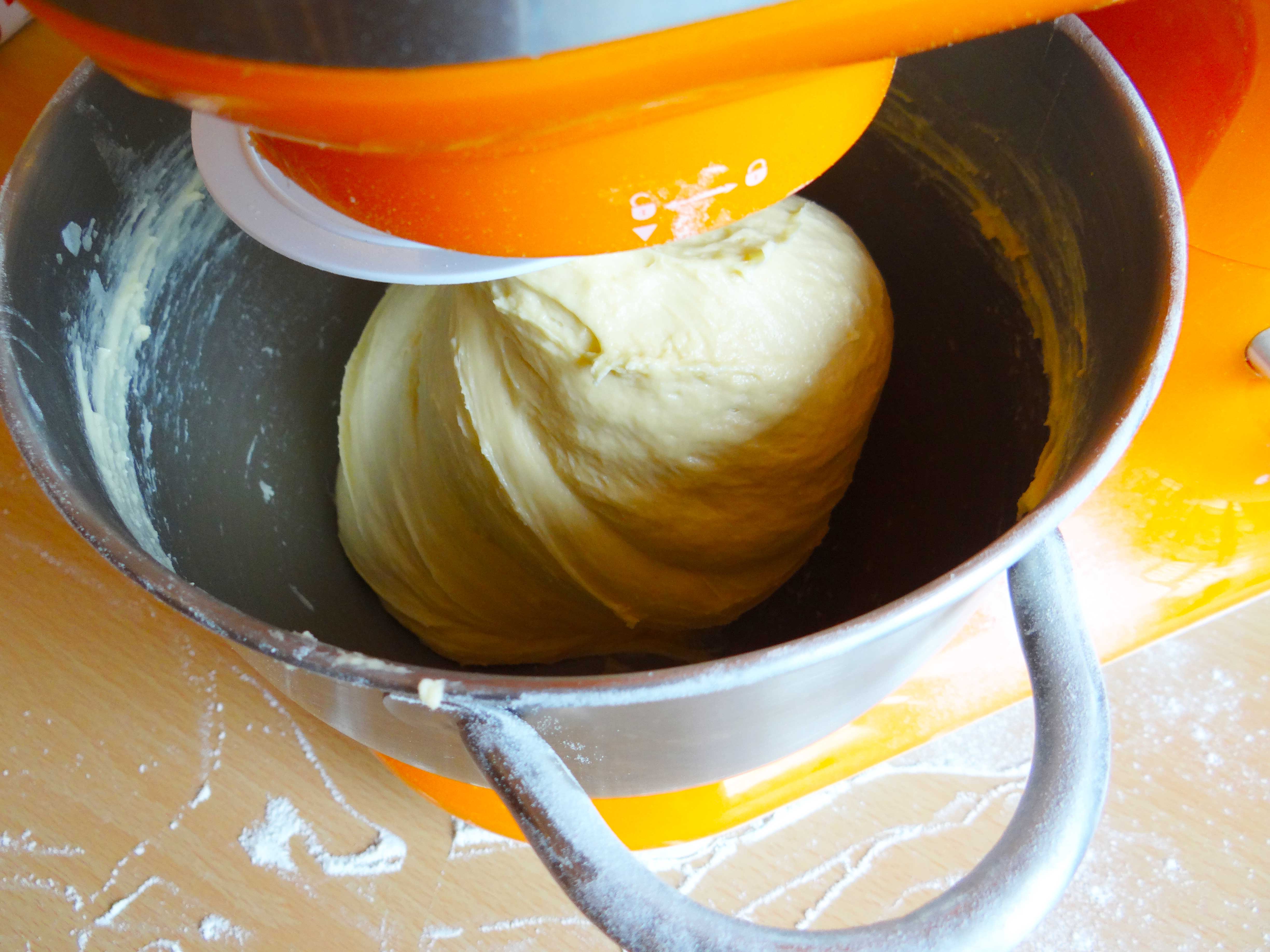 4. Punem deoparte o cană de făină si restul o adăugăm peste aluat. Amestecăm cam un minut cu capătul rotund după care montăm cârligul care este special pentru frământat. Frământăm la viteză mică inițial, adăugăm puțin câte puțin din făina pe care am pus-o deoparte. Ideea este ca trebuie să avem un aluat moale si lipicios dar care totuși se desprinde de pe vas. Daca adăugăm prea multă faină chiflele nu vor mai fi pufoase.