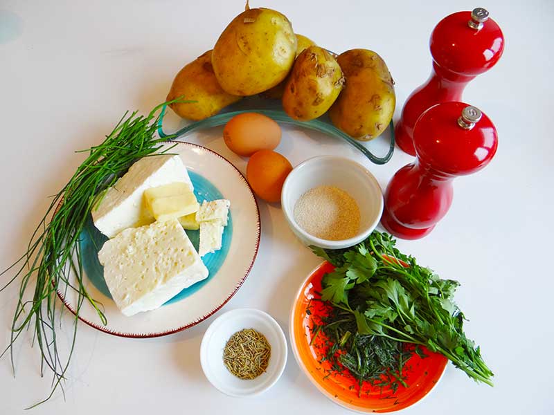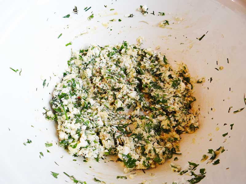 2. Răzuim brânza după care o combinăm cu cele două ouă, cu mărarul, pătrunjelul tocat fin, rozmarinul, pesmetul și firele de chives tăiate mărunt. Piperăm după gust.
