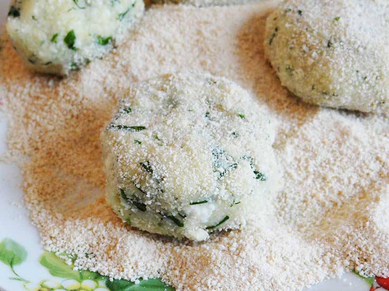 4. Formăm bile, le aplatizăm ușor și apoi le dăm prin pesmet.