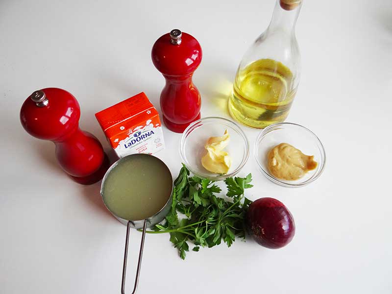 9. Într-o tigaie adâncă punem la încins lingura de ulei și untul. Adăugăm ceapa pe care o călim câteva minute până devine translucidă. Apoi adăugăm muștarul, supa de pui, smântâna, sare și piper după gust. Amestecăm continuu și fierbem totul la foc mic 2-3 minute.